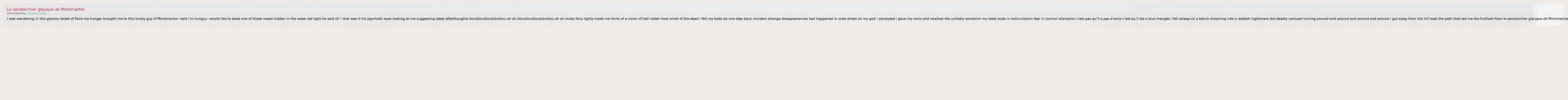 I was wandering in this gloomy street of Paris my hunger brought me to this lonely guy of Montmartre i said i’m hungry i would like to taste one of those meals hidden in the weak red light he said oh ! that was it his psychotic eyes looking at me suggesting deep afterthoughts bloubloubloubloublou ah ah bloubloubloubloublou ah ah dusty fairy lights made me think of a vision of hell rotten food smell of the dead i felt my body do one step back murders strange disappearances had happened in orsel street oh my god ! paralysed i gave my coins and swallow the unlikely sandwich my taste buds in hallucination fear in turmoil alienation c’est pas qu’il a pas d’amis c’est qu’il les a tous mangés i fell asleep on a bench drowning into a reddish nightmare the deadly carousel turning around and around and around and around i got away from the hill took the path that led me the furthest from le sandwichier glauque de Montmartre