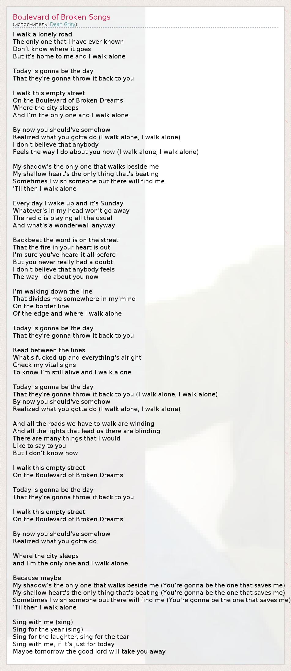 ГлавнаяИсполнителиDean GrayBoulevard of Broken Songs