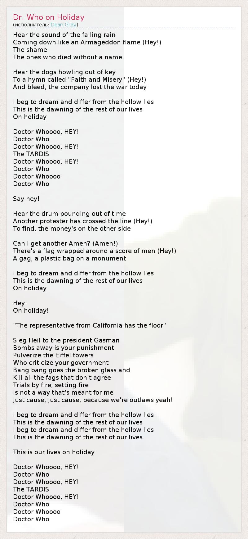 А как ты думаешь, о чем песня "Dr. Who on Holiday" ?