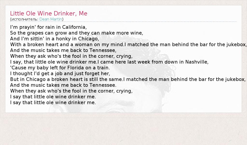 А как ты думаешь, о чем песня "Little Ole Wine Drinker, Me" ?