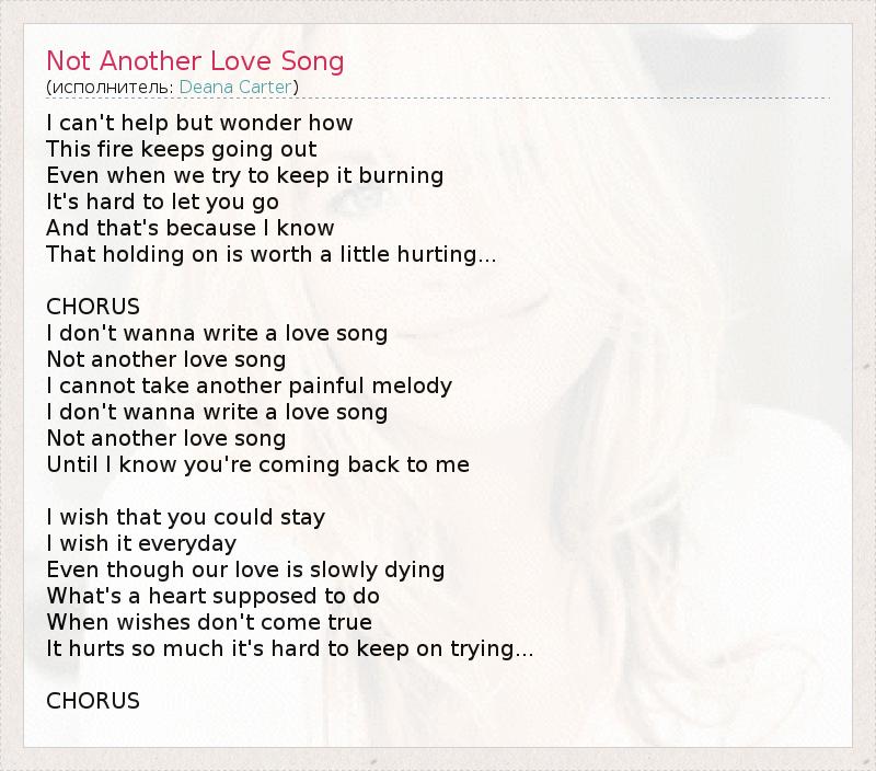 I can't help but wonder how This fire keeps going out Even when we try to keep it burning It's hard to let you go And that's because I know That holding on is worth a little hurting... CHORUS I don't wanna write a love song Not another love song I cannot take another painful melody I don't wanna write a love song Not another love song Until I know you're coming back to me I wish that you could stay I wish it everyday Even though our love is slowly dying What's a heart supposed to do When wishes don't come true It hurts so much it's hard to keep on trying... CHORUS