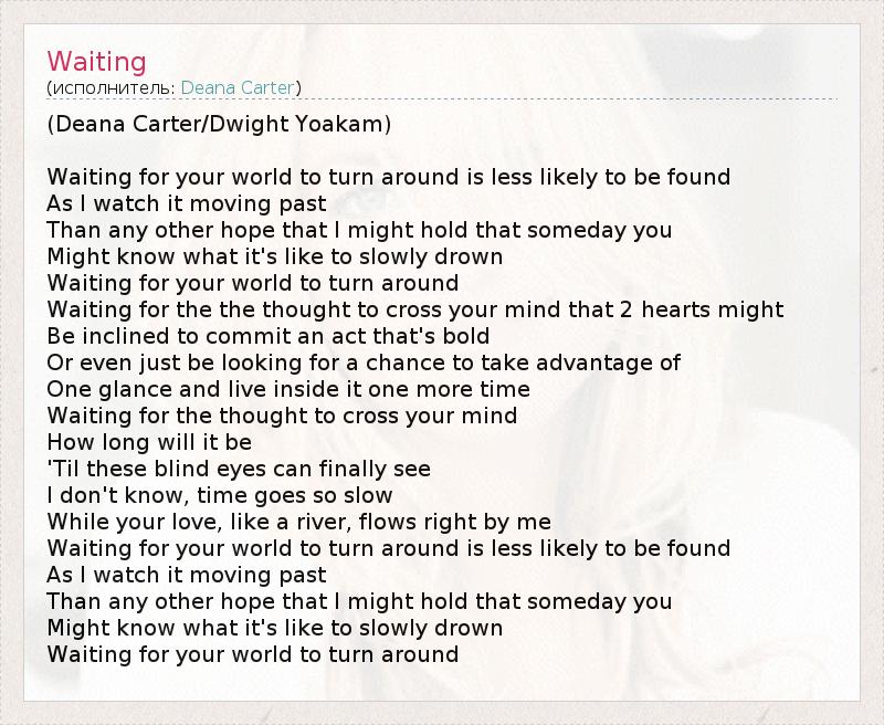 (Deana Carter/Dwight Yoakam) Waiting for your world to turn around is less likely to be found As I watch it moving past Than any other hope that I might hold that someday you Might know what it's like to slowly drown Waiting for your world to turn around Waiting for the the thought to cross your mind that 2 hearts might Be inclined to commit an act that's bold Or even just be looking for a chance to take advantage of One glance and live inside it one more time Waiting for the thought to cross your mind How long will it be 'Til these blind eyes can finally see I don't know, time goes so slow While your love, like a river, flows right by me Waiting for your world to turn around is less likely to be found As I watch it moving past Than any other hope that I might hold that someday you Might know what it's like to slowly drown Waiting for your world to turn around