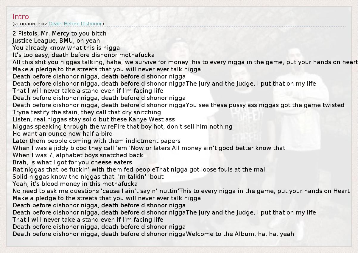 2 Pistols, Mr. Mercy to you bitch Justice League, BMU, oh yeah You already know what this is nigga It's too easy, death before dishonor mothafucka All this shit you niggas talking, haha, we survive for moneyThis to every nigga in the game, put your hands on heart Make a pledge to the streets that you will never ever talk nigga Death before dishonor nigga, death before dishonor nigga Death before dishonor nigga, death before dishonor niggaThe jury and the judge, I put that on my life That I will never take a stand even if I'm facing life Death before dishonor nigga, death before dishonor nigga Death before dishonor nigga, death before dishonor niggaYou see these pussy ass niggas got the game twisted Tryna testify the stain, they call that dry snitching Listen, real niggas stay solid but these Kanye West ass Niggas speaking through the wireFire that boy hot, don't sell him nothing He want an ounce now half a bird Later them people coming with them indictment papers When I was a jiddy blood they call 'em 'Now or laters'All money ain't good better know that When I was 7, alphabet boys snatched back Brah, is what I got for you cheese eaters Rat niggas that be fuckin' with them fed peopleThat nigga got loose fouls at the mall Solid niggas know the niggas that I'm talkin' 'bout Yeah, it's blood money in this mothafucka No need to ask me questions 'cause I ain't sayin' nuttin'This to every nigga in the game, put your hands on Heart Make a pledge to the streets that you will never ever talk nigga Death before dishonor nigga, death before dishonor nigga Death before dishonor nigga, death before dishonor niggaThe jury and the judge, I put that on my life That I will never take a stand even if I'm facing life Death before dishonor nigga, death before dishonor nigga Death before dishonor nigga, death before dishonor niggaWelcome to the Album, ha, ha, yeah