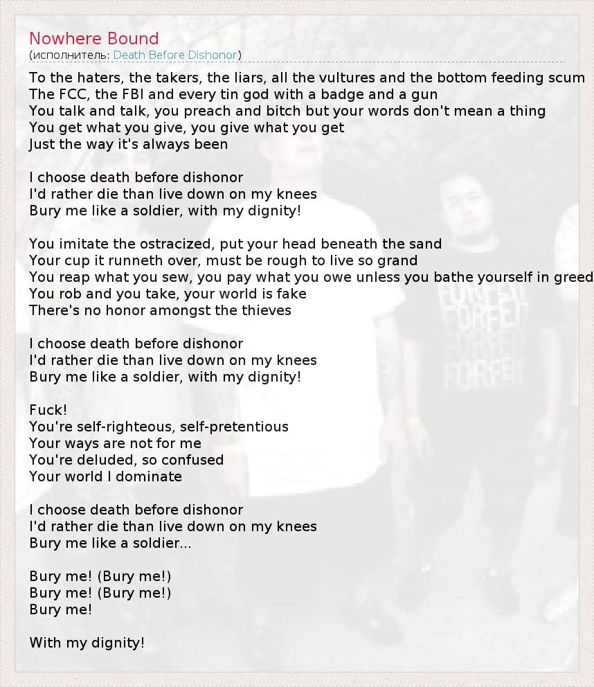 Это интересно:1) NYHC из Нью Йорка. Записали одну демку в 1987-м2) Хардкор из Бостона.Группа была основана в 2000 году. Death Before Dishonor получают восторженные отзывы о своих неумолимых гимнах и диких концертах. Их стремление непрестанно работать привлекло внимание Bridge Nine Records, еще одного Бостонского формирования, созданного на тех же идеалах, которые легли в основу Death Before Dishonor – стойкость, побуждение и страсть.... продолжение
