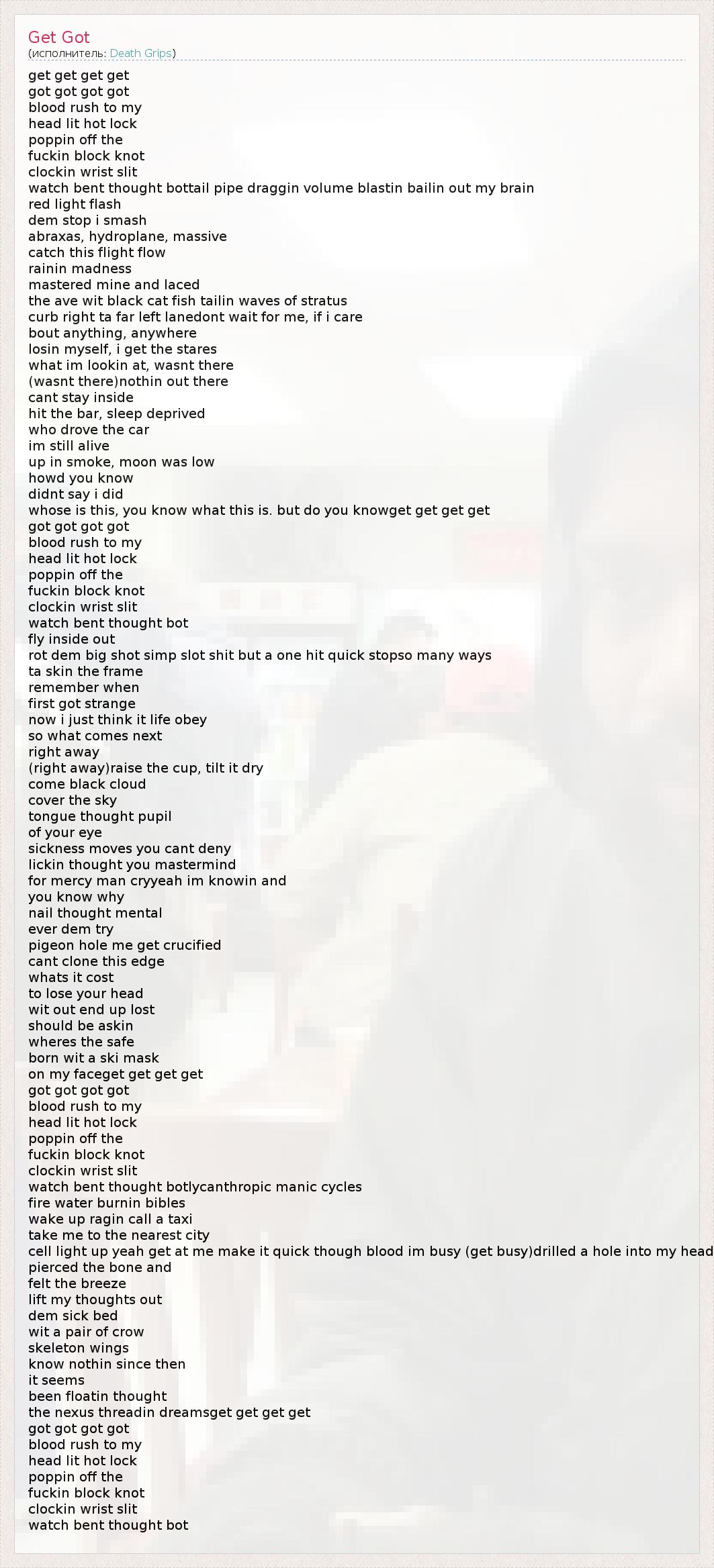 get get get get got got got got blood rush to my head lit hot lock poppin off the fuckin block knot clockin wrist slit watch bent thought bottail pipe draggin volume blastin bailin out my brain red light flash dem stop i smash abraxas, hydroplane, massive catch this flight flow rainin madness mastered mine and laced the ave wit black cat fish tailin waves of stratus curb right ta far left lanedont wait for me, if i care bout anything, anywhere losin myself, i get the stares what im lookin at, wasnt there (wasnt there)nothin out there cant stay inside hit the bar, sleep deprived who drove the car im still alive up in smoke, moon was low howd you know didnt say i did whose is this, you know what this is. but do you knowget get get get got got got got blood rush to my head lit hot lock poppin off the fuckin block knot clockin wrist slit watch bent thought bot fly inside out rot dem big shot simp slot shit but a one hit quick stopso many ways ta skin the frame remember when first got strange now i just think it life obey so what comes next right away (right away)raise the cup, tilt it dry come black cloud cover the sky tongue thought pupil of your eye sickness moves you cant deny lickin thought you mastermind for mercy man cryyeah im knowin and you know why nail thought mental ever dem try pigeon hole me get crucified cant clone this edge whats it cost to lose your head wit out end up lost should be askin wheres the safe born wit a ski mask on my faceget get get get got got got got blood rush to my head lit hot lock poppin off the fuckin block knot clockin wrist slit watch bent thought botlycanthropic manic cycles fire water burnin bibles wake up ragin call a taxi take me to the nearest city cell light up yeah get at me make it quick though blood im busy (get busy)drilled a hole into my head pierced the bone and felt the breeze lift my thoughts out dem sick bed wit a pair of crow skeleton wings know nothin since then it seems been floatin thought the nexus threadin dreamsget get get get got got got got blood rush to my head lit hot lock poppin off the fuckin block knot clockin wrist slit watch bent thought bot
