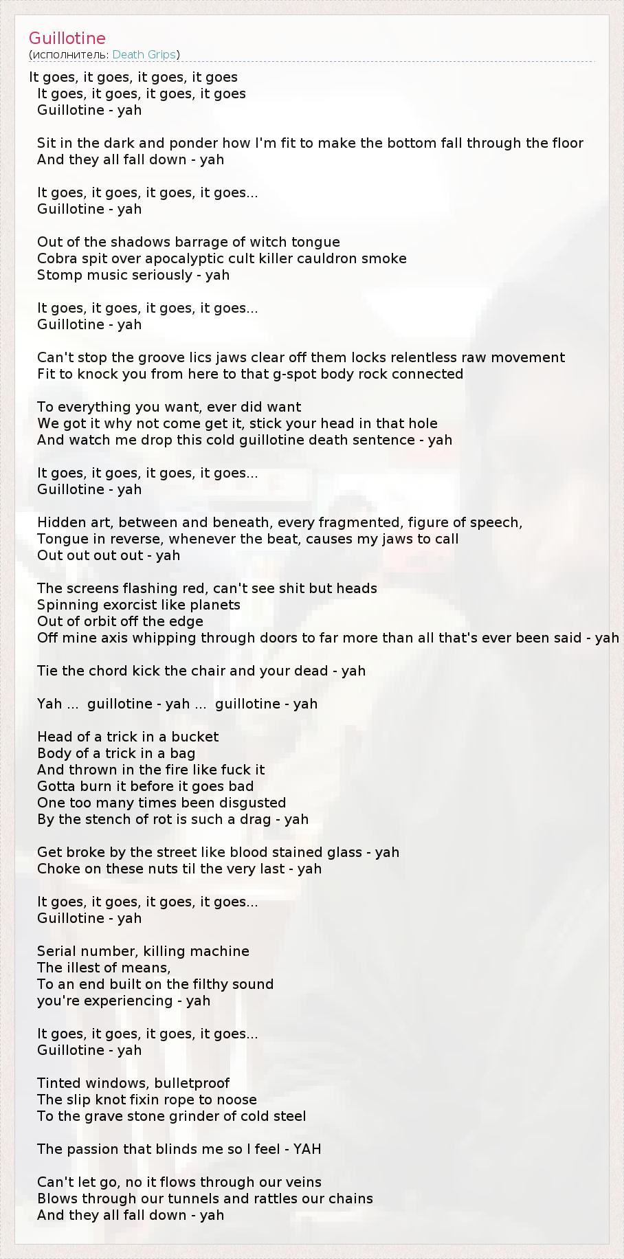Death Grips — музыкальный коллектив из Сакраменто (Калифорния). Они исполняют агрессивную и мрачную разновидность экспериментального хип-хопа с неравномерным ритмом, зачастую перегруженным звуком и яростным, кричащий вокалом. В состав группы входят рэпер Стефан Бернетт (MC Ride), барабанщик Зак Хилл и клавишник Энди Морин.