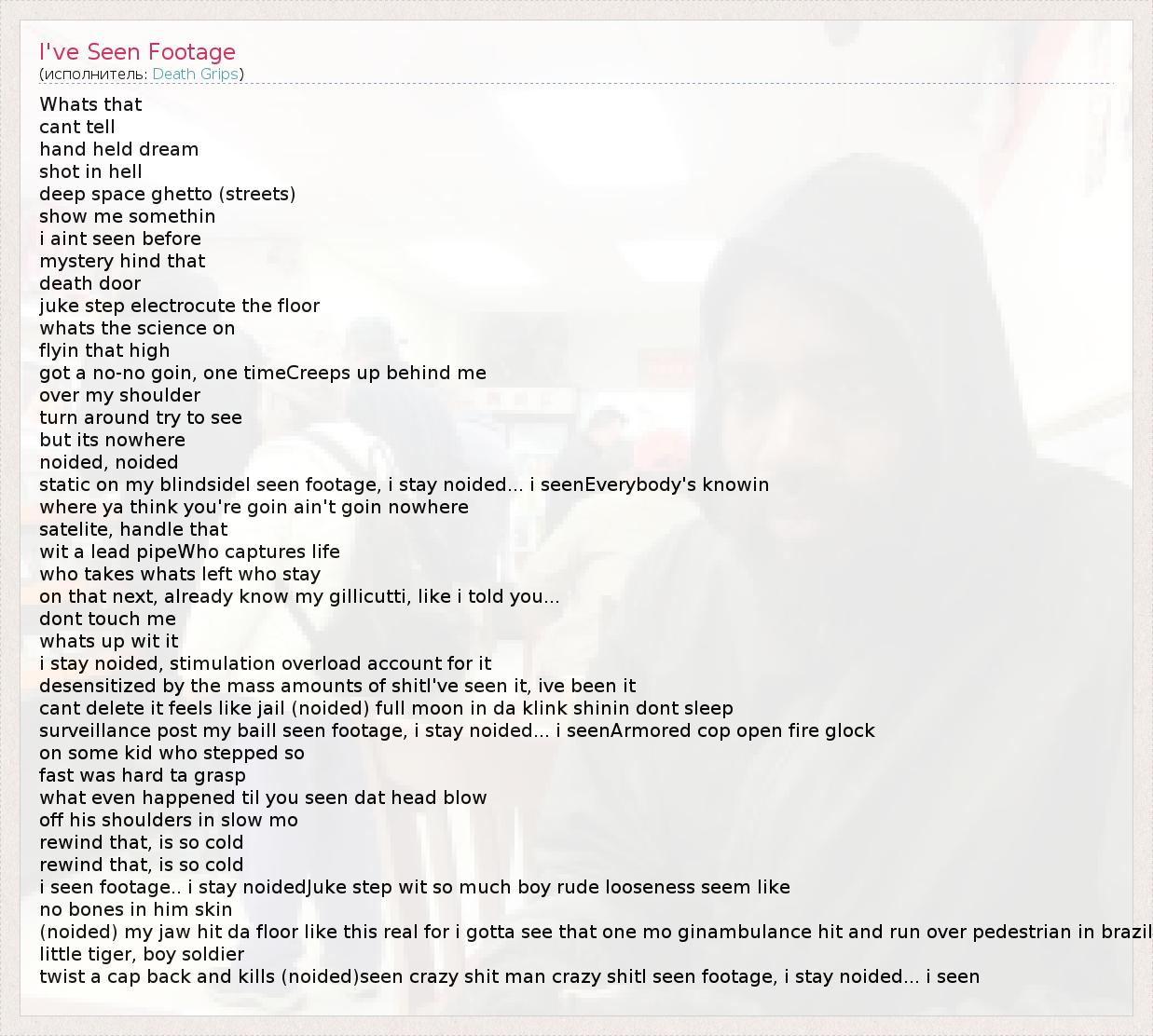 Whats that cant tell hand held dream shot in hell deep space ghetto (streets) show me somethin i aint seen before mystery hind that death door juke step electrocute the floor whats the science on flyin that high got a no-no goin, one timeCreeps up behind me over my shoulder turn around try to see but its nowhere noided, noided static on my blindsideI seen footage, i stay noided... i seenEverybody's knowin where ya think you're goin ain't goin nowhere satelite, handle that wit a lead pipeWho captures life who takes whats left who stay on that next, already know my gillicutti, like i told you... dont touch me whats up wit it i stay noided, stimulation overload account for it desensitized by the mass amounts of shitI've seen it, ive been it cant delete it feels like jail (noided) full moon in da klink shinin dont sleep surveillance post my bailI seen footage, i stay noided... i seenArmored cop open fire glock on some kid who stepped so fast was hard ta grasp what even happened til you seen dat head blow off his shoulders in slow mo rewind that, is so cold rewind that, is so cold i seen footage.. i stay noidedJuke step wit so much boy rude looseness seem like no bones in him skin (noided) my jaw hit da floor like this real for i gotta see that one mo ginambulance hit and run over pedestrian in brazil little tiger, boy soldier twist a cap back and kills (noided)seen crazy shit man crazy shitI seen footage, i stay noided... i seen