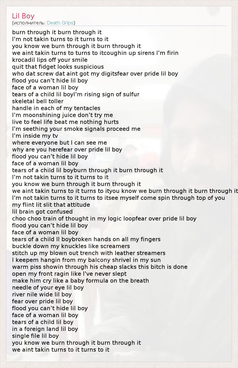 burn through it burn through it I'm not takin turns to it turns to it you know we burn through it burn through it we aint takin turns to turns to itcoughin up sirens I'm firin krocadil lips off your smile quit that fidget looks suspicious who dat screw dat aint got my digitsfear over pride lil boy flood you can't hide lil boy face of a woman lil boy tears of a child lil boyI'm rising sign of sulfur skeletal bell toller handle in each of my tentacles I'm moonshining juice don't try me live to feel life beat me nothing hurts I'm seething your smoke signals proceed me I'm inside my tv where everyone but I can see me why are you herefear over pride lil boy flood you can't hide lil boy face of a woman lil boy tears of a child lil boyburn through it burn through it I'm not takin turns to it turns to it you know we burn through it burn through it we aint takin turns to it turns to ityou know we burn through it burn through it I'm not takin turns to it turns to itsee myself come spin through top of you my flint lit slit that attitude lil brain got confused choo choo train of thought in my logic loopfear over pride lil boy flood you can't hide lil boy face of a woman lil boy tears of a child ll boybroken hands on all my fingers buckle down my knuckles like screamers stitch up my blown out trench with leather streamers I keepem hangin from my balcony shrivel in my sun warm piss showin through his cheap slacks this bitch is done open my front ragin like I've never slept make him cry like a baby formula on the breath needle of your eye lil boy river nile wide lil boy fear over pride lil boy flood you can't hide lil boy face of a woman lil boy tears of a child lil boy in a foreign land lil boy single file lil boy you know we burn through it burn through it we aint takin turns to it turns to it