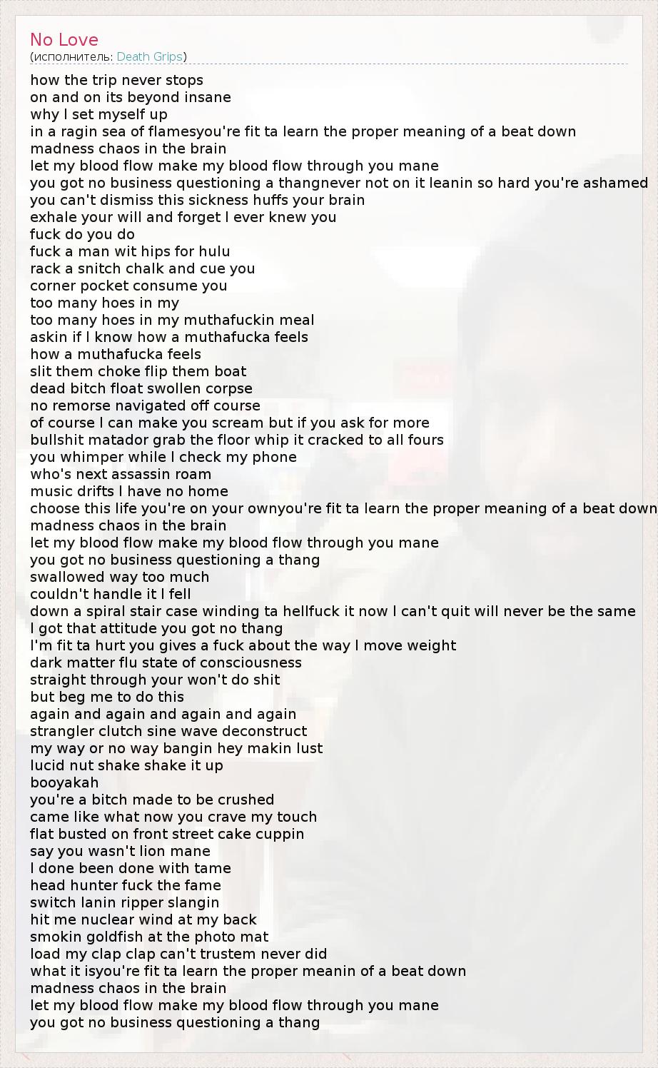 how the trip never stops on and on its beyond insane why I set myself up in a ragin sea of flamesyou're fit ta learn the proper meaning of a beat down madness chaos in the brain let my blood flow make my blood flow through you mane you got no business questioning a thangnever not on it leanin so hard you're ashamed you can't dismiss this sickness huffs your brain exhale your will and forget I ever knew you fuck do you do fuck a man wit hips for hulu rack a snitch chalk and cue you corner pocket consume you too many hoes in my too many hoes in my muthafuckin meal askin if I know how a muthafucka feels how a muthafucka feels slit them choke flip them boat dead bitch float swollen corpse no remorse navigated off course of course I can make you scream but if you ask for more bullshit matador grab the floor whip it cracked to all fours you whimper while I check my phone who's next assassin roam music drifts I have no home choose this life you're on your ownyou're fit ta learn the proper meaning of a beat down madness chaos in the brain let my blood flow make my blood flow through you mane you got no business questioning a thang swallowed way too much couldn't handle it I fell down a spiral stair case winding ta hellfuck it now I can't quit will never be the same I got that attitude you got no thang I'm fit ta hurt you gives a fuck about the way I move weight dark matter flu state of consciousness straight through your won't do shit but beg me to do this again and again and again and again strangler clutch sine wave deconstruct my way or no way bangin hey makin lust lucid nut shake shake it up booyakah you're a bitch made to be crushed came like what now you crave my touch flat busted on front street cake cuppin say you wasn't lion mane I done been done with tame head hunter fuck the fame switch lanin ripper slangin hit me nuclear wind at my back smokin goldfish at the photo mat load my clap clap can't trustem never did what it isyou're fit ta learn the proper meanin of a beat down madness chaos in the brain let my blood flow make my blood flow through you mane you got no business questioning a thang