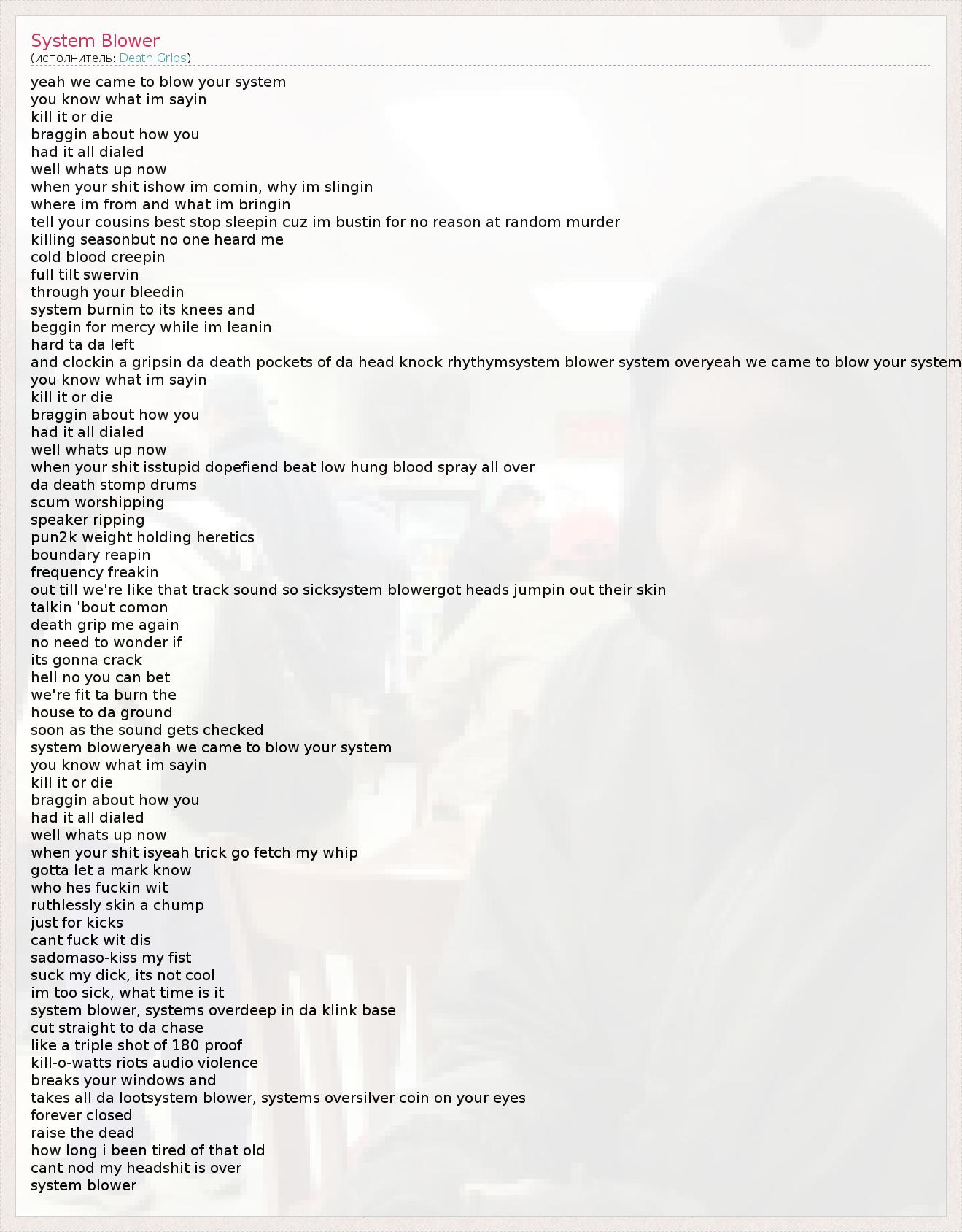 yeah we came to blow your system you know what im sayin kill it or die braggin about how you had it all dialed well whats up now when your shit ishow im comin, why im slingin where im from and what im bringin tell your cousins best stop sleepin cuz im bustin for no reason at random murder killing seasonbut no one heard me cold blood creepin full tilt swervin through your bleedin system burnin to its knees and beggin for mercy while im leanin hard ta da left and clockin a gripsin da death pockets of da head knock rhythymsystem blower system overyeah we came to blow your system you know what im sayin kill it or die braggin about how you had it all dialed well whats up now when your shit isstupid dopefiend beat low hung blood spray all over da death stomp drums scum worshipping speaker ripping pun2k weight holding heretics boundary reapin frequency freakin out till we're like that track sound so sicksystem blowergot heads jumpin out their skin talkin 'bout comon death grip me again no need to wonder if its gonna crack hell no you can bet we're fit ta burn the house to da ground soon as the sound gets checked system bloweryeah we came to blow your system you know what im sayin kill it or die braggin about how you had it all dialed well whats up now when your shit isyeah trick go fetch my whip gotta let a mark know who hes fuckin wit ruthlessly skin a chump just for kicks cant fuck wit dis sadomaso-kiss my fist suck my dick, its not cool im too sick, what time is it system blower, systems overdeep in da klink base cut straight to da chase like a triple shot of 180 proof kill-o-watts riots audio violence breaks your windows and takes all da lootsystem blower, systems oversilver coin on your eyes forever closed raise the dead how long i been tired of that old cant nod my headshit is over system blower