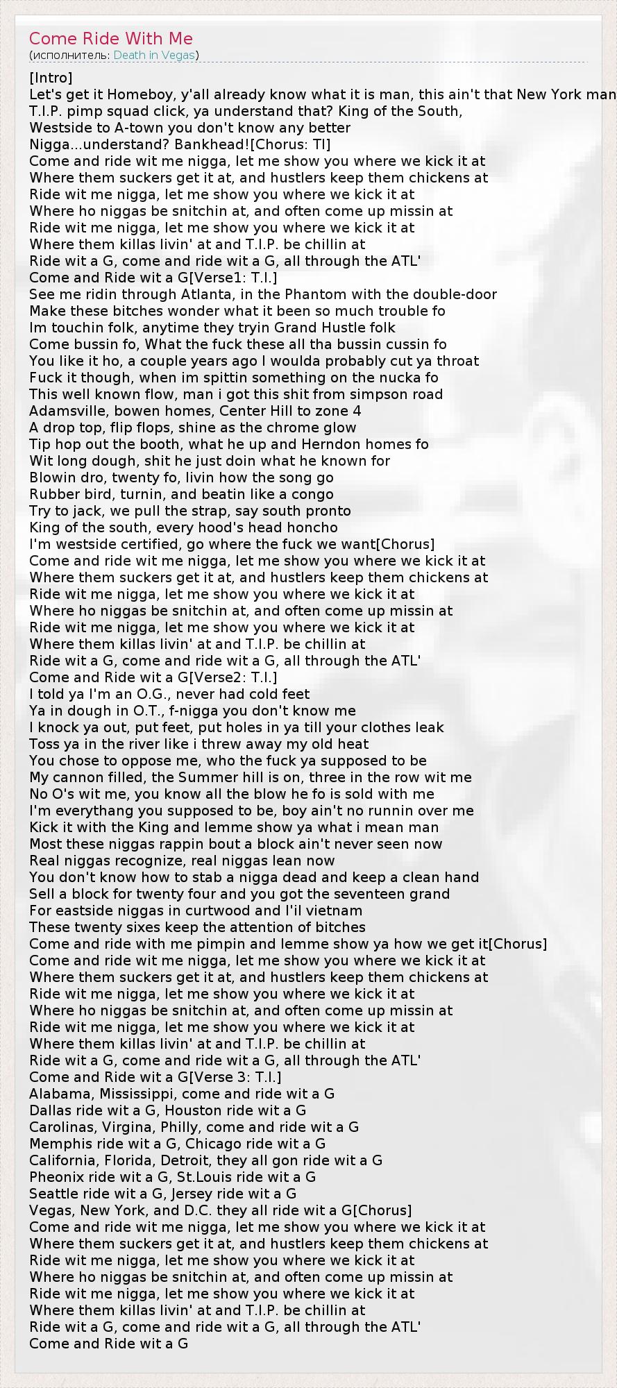 [Intro] Let's get it Homeboy, y'all already know what it is man, this ain't that New York man T.I.P. pimp squad click, ya understand that? King of the South, Westside to A-town you don't know any better Nigga...understand? Bankhead![Chorus: TI] Come and ride wit me nigga, let me show you where we kick it at Where them suckers get it at, and hustlers keep them chickens at Ride wit me nigga, let me show you where we kick it at Where ho niggas be snitchin at, and often come up missin at Ride wit me nigga, let me show you where we kick it at Where them killas livin' at and T.I.P. be chillin at Ride wit a G, come and ride wit a G, all through the ATL' Come and Ride wit a G[Verse1: T.I.] See me ridin through Atlanta, in the Phantom with the double-door Make these bitches wonder what it been so much trouble fo Im touchin folk, anytime they tryin Grand Hustle folk Come bussin fo, What the fuck these all tha bussin cussin fo You like it ho, a couple years ago I woulda probably cut ya throat Fuck it though, when im spittin something on the nucka fo This well known flow, man i got this shit from simpson road Adamsville, bowen homes, Center Hill to zone 4 A drop top, flip flops, shine as the chrome glow Tip hop out the booth, what he up and Herndon homes fo Wit long dough, shit he just doin what he known for Blowin dro, twenty fo, livin how the song go Rubber bird, turnin, and beatin like a congo Try to jack, we pull the strap, say south pronto King of the south, every hood's head honcho I'm westside certified, go where the fuck we want[Chorus] Come and ride wit me nigga, let me show you where we kick it at Where them suckers get it at, and hustlers keep them chickens at Ride wit me nigga, let me show you where we kick it at Where ho niggas be snitchin at, and often come up missin at Ride wit me nigga, let me show you where we kick it at Where them killas livin' at and T.I.P. be chillin at Ride wit a G, come and ride wit a G, all through the ATL' Come and Ride wit a G[Verse2: T.I.] I told ya I'm an O.G., never had cold feet Ya in dough in O.T., f-nigga you don't know me I knock ya out, put feet, put holes in ya till your clothes leak Toss ya in the river like i threw away my old heat You chose to oppose me, who the fuck ya supposed to be My cannon filled, the Summer hill is on, three in the row wit me No O's wit me, you know all the blow he fo is sold with me I'm everythang you supposed to be, boy ain't no runnin over me Kick it with the King and lemme show ya what i mean man Most these niggas rappin bout a block ain't never seen now Real niggas recognize, real niggas lean now You don't know how to stab a nigga dead and keep a clean hand Sell a block for twenty four and you got the seventeen grand For eastside niggas in curtwood and l'il vietnam These twenty sixes keep the attention of bitches Come and ride with me pimpin and lemme show ya how we get it[Chorus] Come and ride wit me nigga, let me show you where we kick it at Where them suckers get it at, and hustlers keep them chickens at Ride wit me nigga, let me show you where we kick it at Where ho niggas be snitchin at, and often come up missin at Ride wit me nigga, let me show you where we kick it at Where them killas livin' at and T.I.P. be chillin at Ride wit a G, come and ride wit a G, all through the ATL' Come and Ride wit a G[Verse 3: T.I.] Alabama, Mississippi, come and ride wit a G Dallas ride wit a G, Houston ride wit a G Carolinas, Virgina, Philly, come and ride wit a G Memphis ride wit a G, Chicago ride wit a G California, Florida, Detroit, they all gon ride wit a G Pheonix ride wit a G, St.Louis ride wit a G Seattle ride wit a G, Jersey ride wit a G Vegas, New York, and D.C. they all ride wit a G[Chorus] Come and ride wit me nigga, let me show you where we kick it at Where them suckers get it at, and hustlers keep them chickens at Ride wit me nigga, let me show you where we kick it at Where ho niggas be snitchin at, and often come up missin at Ride wit me nigga, let me show you where we kick it at Where them killas livin' at and T.I.P. be chillin at Ride wit a G, come and ride wit a G, all through the ATL' Come and Ride wit a G