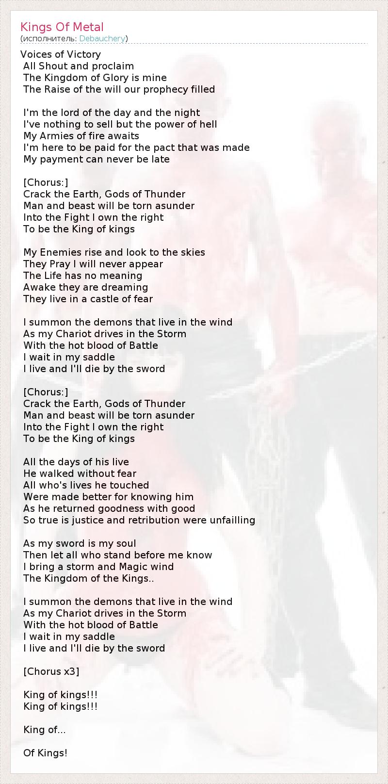 Voices of Victory All Shout and proclaim The Kingdom of Glory is mine The Raise of the will our prophecy filled I'm the lord of the day and the night I've nothing to sell but the power of hell My Armies of fire awaits I'm here to be paid for the pact that was made My payment can never be late [Chorus:] Crack the Earth, Gods of Thunder Man and beast will be torn asunder Into the Fight I own the right To be the King of kings My Enemies rise and look to the skies They Pray I will never appear The Life has no meaning Awake they are dreaming They live in a castle of fear I summon the demons that live in the wind As my Chariot drives in the Storm With the hot blood of Battle I wait in my saddle I live and I'll die by the sword [Chorus:] Crack the Earth, Gods of Thunder Man and beast will be torn asunder Into the Fight I own the right To be the King of kings All the days of his live He walked without fear All who's lives he touched Were made better for knowing him As he returned goodness with good So true is justice and retribution were unfailling As my sword is my soul Then let all who stand before me know I bring a storm and Magic wind The Kingdom of the Kings.. I summon the demons that live in the wind As my Chariot drives in the Storm With the hot blood of Battle I wait in my saddle I live and I'll die by the sword [Chorus x3] King of kings!!! King of kings!!! King of... Of Kings!