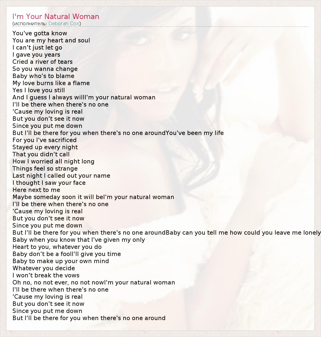 You've gotta know You are my heart and soul I can't just let go I gave you years Cried a river of tears So you wanna change Baby who's to blame My love burns like a flame Yes I love you still And I guess I always willI'm your natural woman I'll be there when there's no one 'Cause my loving is real But you don't see it now Since you put me down But I'll be there for you when there's no one aroundYou've been my life For you I've sacrificed Stayed up every night That you didn't call How I worried all night long Things feel so strange Last night I called out your name I thought I saw your face Here next to me Maybe someday soon it will beI'm your natural woman I'll be there when there's no one 'Cause my loving is real But you don't see it now Since you put me down But I'll be there for you when there's no one aroundBaby can you tell me how could you leave me lonely Baby when you know that I've given my only Heart to you, whatever you do Baby don't be a foolI'll give you time Baby to make up your own mind Whatever you decide I won't break the vows Oh no, no not ever, no not nowI'm your natural woman I'll be there when there's no one 'Cause my loving is real But you don't see it now Since you put me down But I'll be there for you when there's no one around