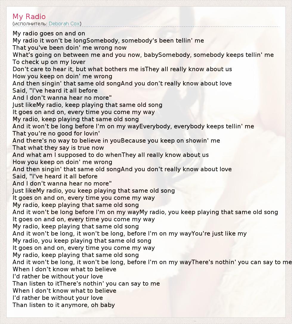 My radio goes on and on My radio it won't be longSomebody, somebody's been tellin' me That you've been doin' me wrong now What's going on between me and you now, babySomebody, somebody keeps tellin' me To check up on my lover Don't care to hear it, but what bothers me isThey all really know about us How you keep on doin' me wrong And then singin' that same old songAnd you don't really know about love Said, "I've heard it all before And I don't wanna hear no more" Just likeMy radio, keep playing that same old song It goes on and on, every time you come my way My radio, keep playing that same old song And it won't be long before I'm on my wayEverybody, everybody keeps tellin' me That you're no good for lovin' And there's no way to believe in youBecause you keep on showin' me That what they say is true now And what am I supposed to do whenThey all really know about us How you keep on doin' me wrong And then singin' that same old songAnd you don't really know about love Said, "I've heard it all before And I don't wanna hear no more" Just likeMy radio, you keep playing that same old song It goes on and on, every time you come my way My radio, keep playing that same old song And it won't be long before I'm on my wayMy radio, you keep playing that same old song It goes on and on, every time you come my way My radio, keep playing that same old song And it won't be long, it won't be long, before I'm on my wayYou're just like my My radio, you keep playing that same old song It goes on and on, every time you come my way My radio, keep playing that same old song And it won't be long, it won't be long, before I'm on my wayThere's nothin' you can say to me When I don't know what to believe I'd rather be without your love Than listen to itThere's nothin' you can say to me When I don't know what to believe I'd rather be without your love Than listen to it anymore, oh baby