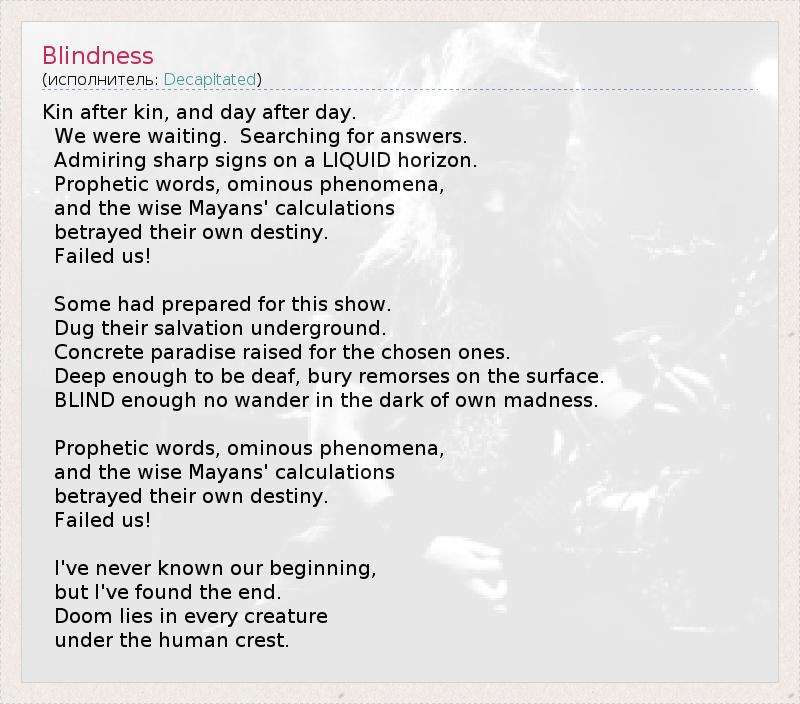 Это интересно:Трое основателей команды Decapitated из польского города Кросно стали, пожалуй, самыми молодыми исполнителями в истории death metal. Ведь на момент создания группы (1996 год) самому старшему её участнику было 15, а самому младшему – 12 лет! Обязанности ребята распределили так: Вогг взял гитару, Витек уселся за ударные, а Саурону досталась участь вокалиста. В 1997 году в коллективе появился еще один музыкант... продолжение