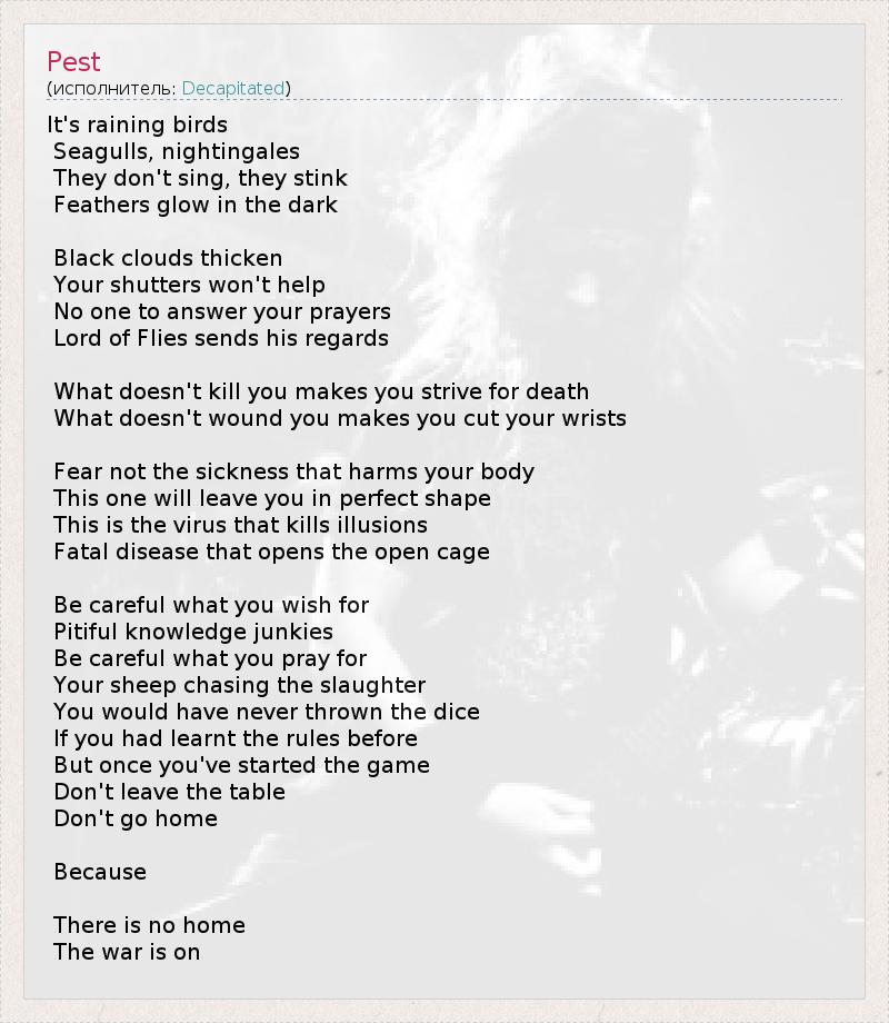 It's raining birds Seagulls, nightingales They don't sing, they stink Feathers glow in the dark Black clouds thicken Your shutters won't help No one to answer your prayers Lord of Flies sends his regards What doesn't kill you makes you strive for death What doesn't wound you makes you cut your wrists Fear not the sickness that harms your body This one will leave you in perfect shape This is the virus that kills illusions Fatal disease that opens the open cage Be careful what you wish for Pitiful knowledge junkies Be careful what you pray for Your sheep chasing the slaughter You would have never thrown the dice If you had learnt the rules before But once you've started the game Don't leave the table Don't go home Because There is no home The war is on