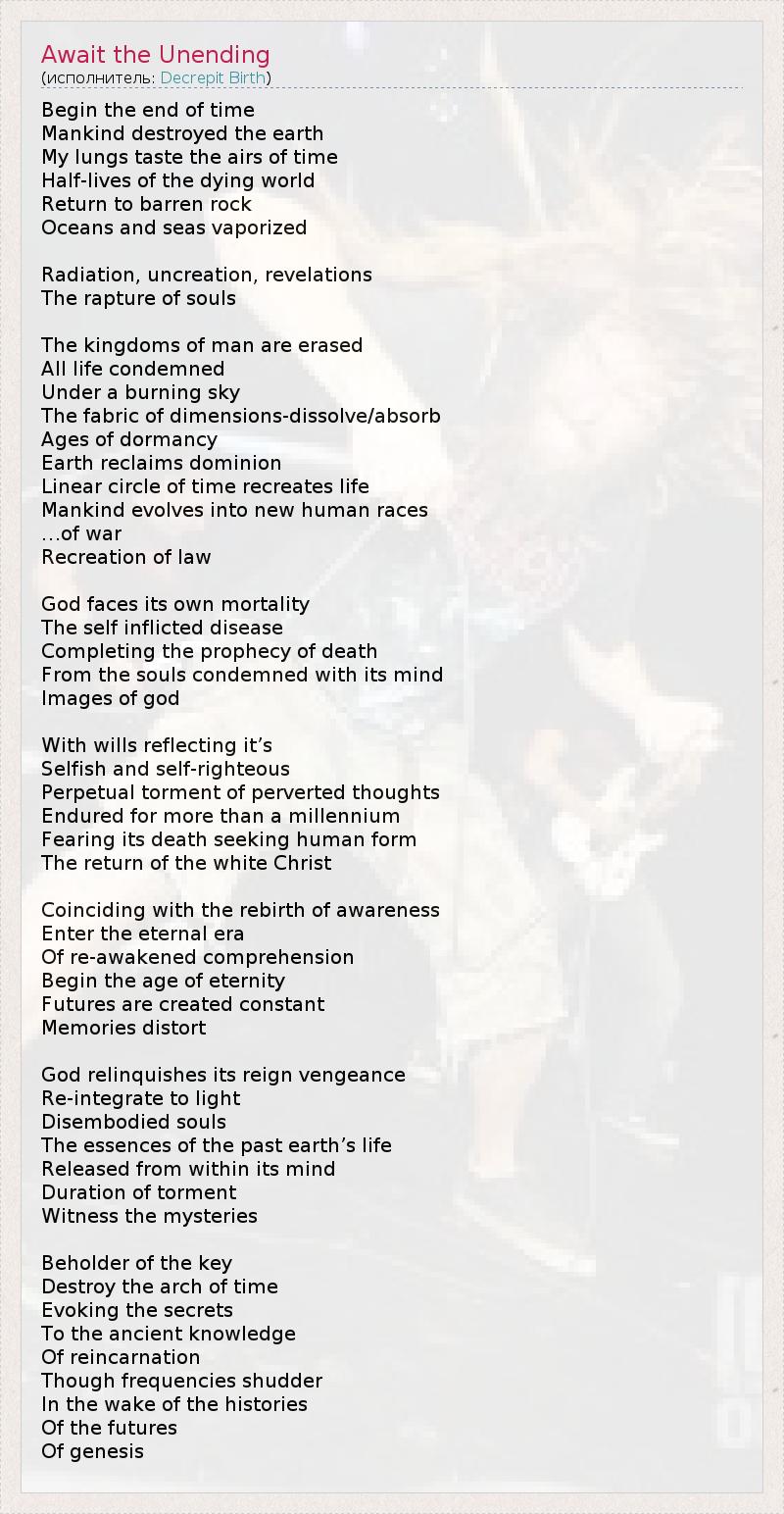 Начните конец времени Человечество уничтожено землю Мои легкие попробовать кондиционирования времени Периоды полураспада в умирающем мире Вернуться к пустой породы Океаны и моря испаряется Радиация, несозидания , откровения Восхищение душ Царство человека стираются Вся жизнь осудили Под палящим небом Ткань размеров растворить / поглощения Века покоя Земля восстанавливает власть Линейный круг времени воссоздает жизнь Человечество развивается в новых человеческих рас ... Войны Отдых закона Бог смотрит его собственной смертности Самостоятельно нанесли болезни Завершение пророчество смерти От души осужденных с ума Изображения бога С завещания отражает это Эгоистичный и самодовольные Вечный мучения извращенных мыслей Вынужденный более чем тысячелетия Опасаясь его смерть ищет человеческую форму Возвращение белого Христа Одновременно с возрождением информированности Введите вечную эру Ре - разбудили понимания Начните возраст вечности Фьючерсы создаются постоянная Воспоминания исказить Бог отказывается от своего господства мести Re интегрироваться в свет бестелесные души В сущности жизни прошлом Земли Выхода изнутри её виду, Продолжительность мучений Свидетель тайны Beholder ключа Уничтожить арку времени Вызывая секреты Для древних знаний реинкарнации Хотя частот содроганием В результате в истории Фьючерсов Бытия