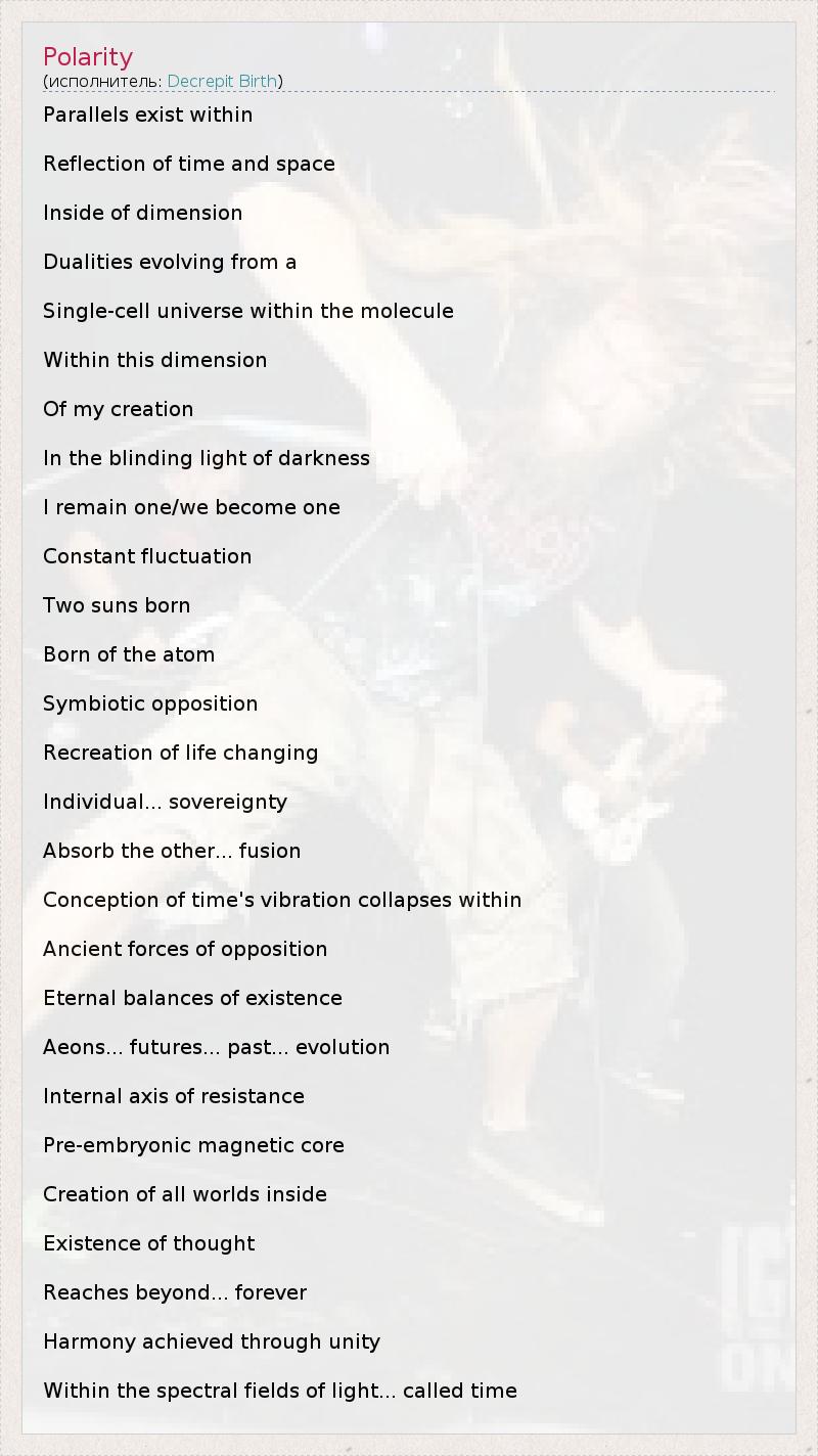 Это интересно:Decrepit Birth родилась в 2001 году в городе Санта-Крус усилиями Matt Sotelo - гитара, Bill Robinson - вокал и Derek Boyer - бас. Изначально, музыканты намеревались играть мощный, брутальный, техничный дэт метал с элементами флоридского дэта ранних 90-х. А так как Мэтт и Дерек уже были одновременными участниками группы Deprecated из южной Калифорнии, начало работы над первым полноформатным альбомом... продолжение