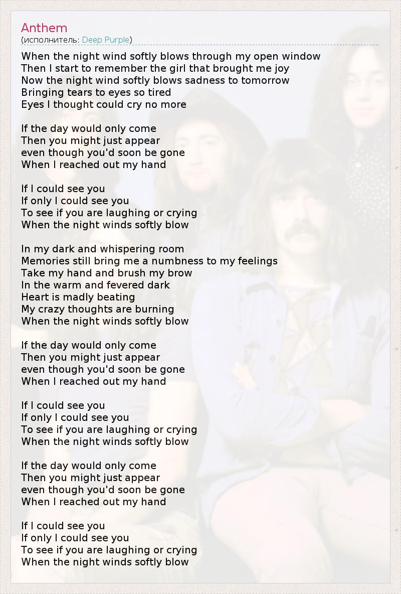 Когда ночной ветер дует сквозь открытое окно Я начинаю вспоминать девушку, подарившую мне много радости Ночной ветер потихоньку навевает тоску на завтрашний день Принося слезы моим усталым глазам Глазам, которые, кажется, уже не в силах плакать Если только день наступит То ты могла бы появиться, только для того чтобы исчезнуть Когда бы я попытался прикоснуться к тебе Если бы я мог тебя увидеть Если бы я только мог увидеть Плачешь ты или смеёшься Пока нежно дует ветер В моей темной комнате я тихо шепчу Воспоминания о тебе все еще тревожат меня Возьми мою руку и погладь ее В теплой и лихорадочной ночи Мое сердце отчаянно бъется Мои мысли пылают Пока нежно дует ветер Если только день наступит То ты могла бы появиться, только для того чтобы исчезнуть Когда бы я попытался прикоснуться к тебе Если бы я мог тебя увидеть Если бы я только мог увидеть Плачешь ты или смеёшься Пока нежно дует ветер Если только день наступит То ты могла бы появиться, только для того чтобы исчезнуть Когда бы я попытался прикоснуться к тебе Если бы я мог тебя увидеть Если бы я только мог увидеть Плачешь ты или смеёшься Пока нежно дует ветер