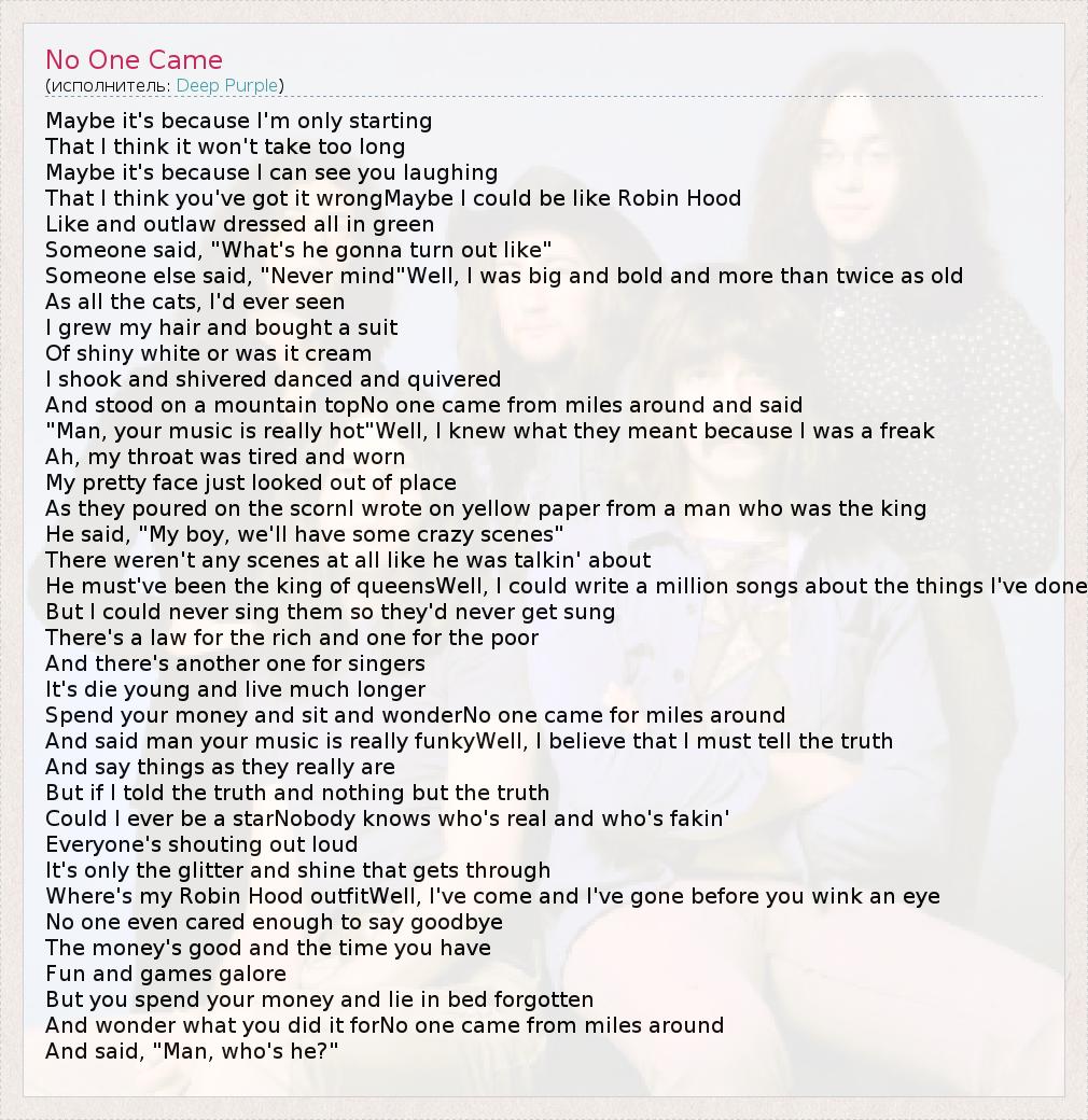 Maybe it's because I'm only starting That I think it won't take too long Maybe it's because I can see you laughing That I think you've got it wrongMaybe I could be like Robin Hood Like and outlaw dressed all in green Someone said, "What's he gonna turn out like" Someone else said, "Never mind"Well, I was big and bold and more than twice as old As all the cats, I'd ever seen I grew my hair and bought a suit Of shiny white or was it cream I shook and shivered danced and quivered And stood on a mountain topNo one came from miles around and said "Man, your music is really hot"Well, I knew what they meant because I was a freak Ah, my throat was tired and worn My pretty face just looked out of place As they poured on the scornI wrote on yellow paper from a man who was the king He said, "My boy, we'll have some crazy scenes" There weren't any scenes at all like he was talkin' about He must've been the king of queensWell, I could write a million songs about the things I've done But I could never sing them so they'd never get sung There's a law for the rich and one for the poor And there's another one for singers It's die young and live much longer Spend your money and sit and wonderNo one came for miles around And said man your music is really funkyWell, I believe that I must tell the truth And say things as they really are But if I told the truth and nothing but the truth Could I ever be a starNobody knows who's real and who's fakin' Everyone's shouting out loud It's only the glitter and shine that gets through Where's my Robin Hood outfitWell, I've come and I've gone before you wink an eye No one even cared enough to say goodbye The money's good and the time you have Fun and games galore But you spend your money and lie in bed forgotten And wonder what you did it forNo one came from miles around And said, "Man, who's he?"