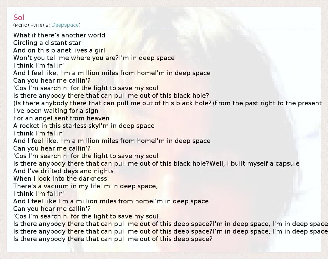 Is there anybody there that can pull me out of this deep space?I'm in deep space, I'm in deep space