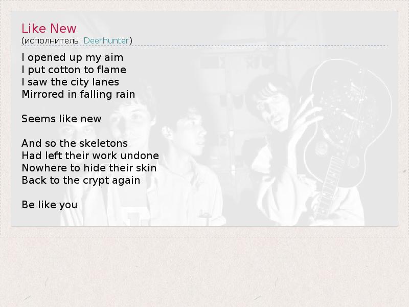 I opened up my aim I put cotton to flame I saw the city lanes Mirrored in falling rain Seems like new And so the skeletons Had left their work undone Nowhere to hide their skin Back to the crypt again Be like you