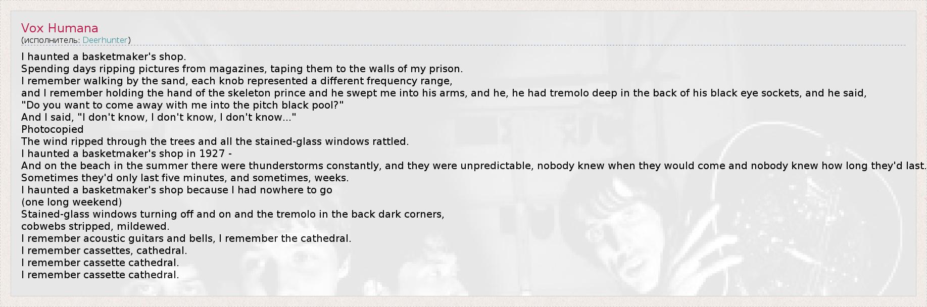 I haunted a basketmaker's shop. Spending days ripping pictures from magazines, taping them to the walls of my prison. I remember walking by the sand, each knob represented a different frequency range, and I remember holding the hand of the skeleton prince and he swept me into his arms, and he, he had tremolo deep in the back of his black eye sockets, and he said, "Do you want to come away with me into the pitch black pool?" And I said, "I don't know, I don't know, I don't know..." Photocopied The wind ripped through the trees and all the stained-glass windows rattled. I haunted a basketmaker's shop in 1927 - And on the beach in the summer there were thunderstorms constantly, and they were unpredictable, nobody knew when they would come and nobody knew how long they'd last. Sometimes they'd only last five minutes, and sometimes, weeks. I haunted a basketmaker's shop because I had nowhere to go (one long weekend) Stained-glass windows turning off and on and the tremolo in the back dark corners, cobwebs stripped, mildewed. I remember acoustic guitars and bells, I remember the cathedral. I remember cassettes, cathedral. I remember cassette cathedral. I remember cassette cathedral.