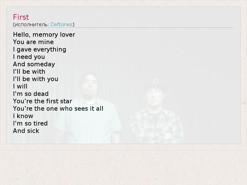 Здравствуй, незабываемая любовь, Ты моя, Я отдал всё. Ты нужна мне, И однажды Я буду, Я буду с тобой. Я буду... Я мертвец, Ты – первая звезда, Ты та, кто видит это всё, Я знаю, Я так устал И болен.