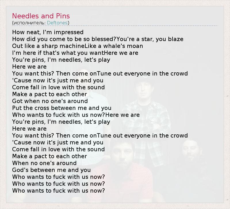 How neat, I'm impressed How did you come to be so blessed?You're a star, you blaze Out like a sharp machineLike a whale's moan I'm here if that's what you wantHere we are You're pins, I'm needles, let's play Here we are You want this? Then come onTune out everyone in the crowd 'Cause now it's just me and you Come fall in love with the sound Make a pact to each other Got when no one's around Put the cross between me and you Who wants to fuck with us now?Here we are You're pins, I'm needles, let's play Here we are You want this? Then come onTune out everyone in the crowd 'Cause now it's just me and you Come fall in love with the sound Make a pact to each other When no one's around God's between me and you Who wants to fuck with us now? Who wants to fuck with us now? Who wants to fuck with us now?