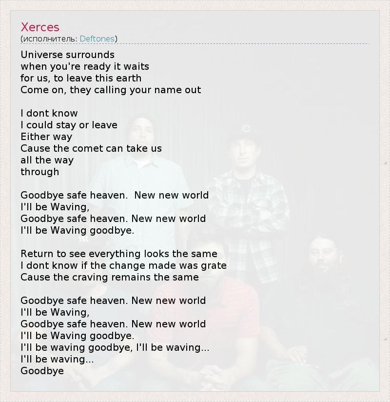 Вселенная окружает Если ты готов, то они ждут нас, чтобы покинуть Землю Пойдем, они называют имена Я не знаю Я могу остаться или уйти Оба варианта Ведь комета может привезти нас обратно Прощай безопасное небо. Новый, новый мир Я буду махать на прощанье Прощай безопасное небо. Новый, новый мир Я буду махать на прощанье Вернусь чтобы посмотреть что все по-старому Я не знаю были ли серьезные изменения Потому, что мое желание все такое же Прощай безопасное небо. Новый новый мир Я буду махать на прощанье Прощай безопасное небо. Новый новый мир Я буду махать на прощанье, прощай. Я буду махать на прощанье, прощай, я буду махать на прощанье... Я буду махать... Прощай