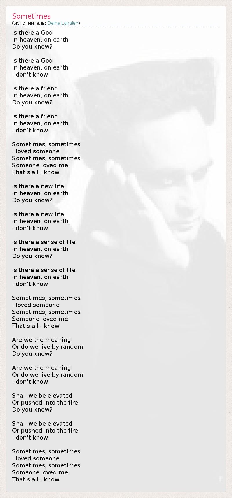 Есть ли Бог На небе, на земле? Знаешь ли ты? Есть ли Бог На небе, на земле? Я не знаю. Есть ли друг На небе, на земле? Знаешь ли ты? Есть ли друг На небе, на земле? Я не знаю. Временами, иногда Я любил кого-нибудь. Временами, иногда Кто-то любил меня, Это все, что мне известно. Есть ли другая жизнь На небе, на земле? Знаешь ли ты? Есть ли другая жизнь, На небе, на земле? Я не знаю. Есть ли смысл жизни На небе, на земле? Знаешь ли ты? Есть ли смысл жизни На небе, на земле? Я не знаю. Временами, иногда Я любил кого-нибудь. Временами, иногда Кто-то любил меня, Это все, что мне известно. Мы живем сами, Или же случайностью? Знаешь ли ты? Мы живем сами, Или же случайностью? Я не знаю. Вознесёмся ли мы на небеса, Или же будем низвергнуты в пламя? Знаешь ли ты? Вознесёмся ли мы на небеса, Или же будем низвергнуты в пламя? Я не знаю. Временами, иногда Я любил кого-нибудь. Временами, иногда Кто-то любил меня, Это все, что мне известно.