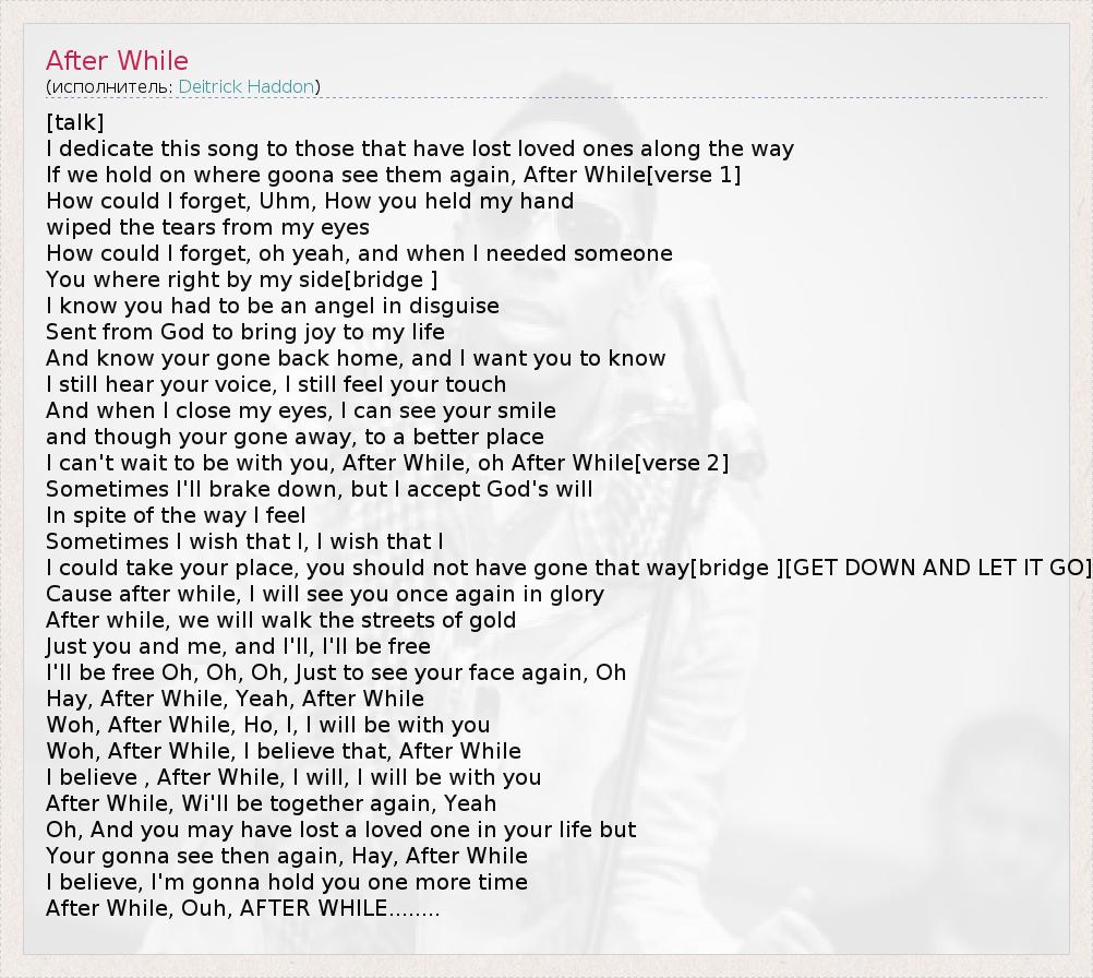 [talk] I dedicate this song to those that have lost loved ones along the way If we hold on where goona see them again, After While[verse 1] How could I forget, Uhm, How you held my hand wiped the tears from my eyes How could I forget, oh yeah, and when I needed someone You where right by my side[bridge ] I know you had to be an angel in disguise Sent from God to bring joy to my life And know your gone back home, and I want you to know I still hear your voice, I still feel your touch And when I close my eyes, I can see your smile and though your gone away, to a better place I can't wait to be with you, After While, oh After While[verse 2] Sometimes I'll brake down, but I accept God's will In spite of the way I feel Sometimes I wish that I, I wish that I I could take your place, you should not have gone that way[bridge ][GET DOWN AND LET IT GO] Cause after while, I will see you once again in glory After while, we will walk the streets of gold Just you and me, and I'll, I'll be free I'll be free Oh, Oh, Oh, Just to see your face again, Oh Hay, After While, Yeah, After While Woh, After While, Ho, I, I will be with you Woh, After While, I believe that, After While I believe , After While, I will, I will be with you After While, Wi'll be together again, Yeah Oh, And you may have lost a loved one in your life but Your gonna see then again, Hay, After While I believe, I'm gonna hold you one more time After While, Ouh, AFTER WHILE........