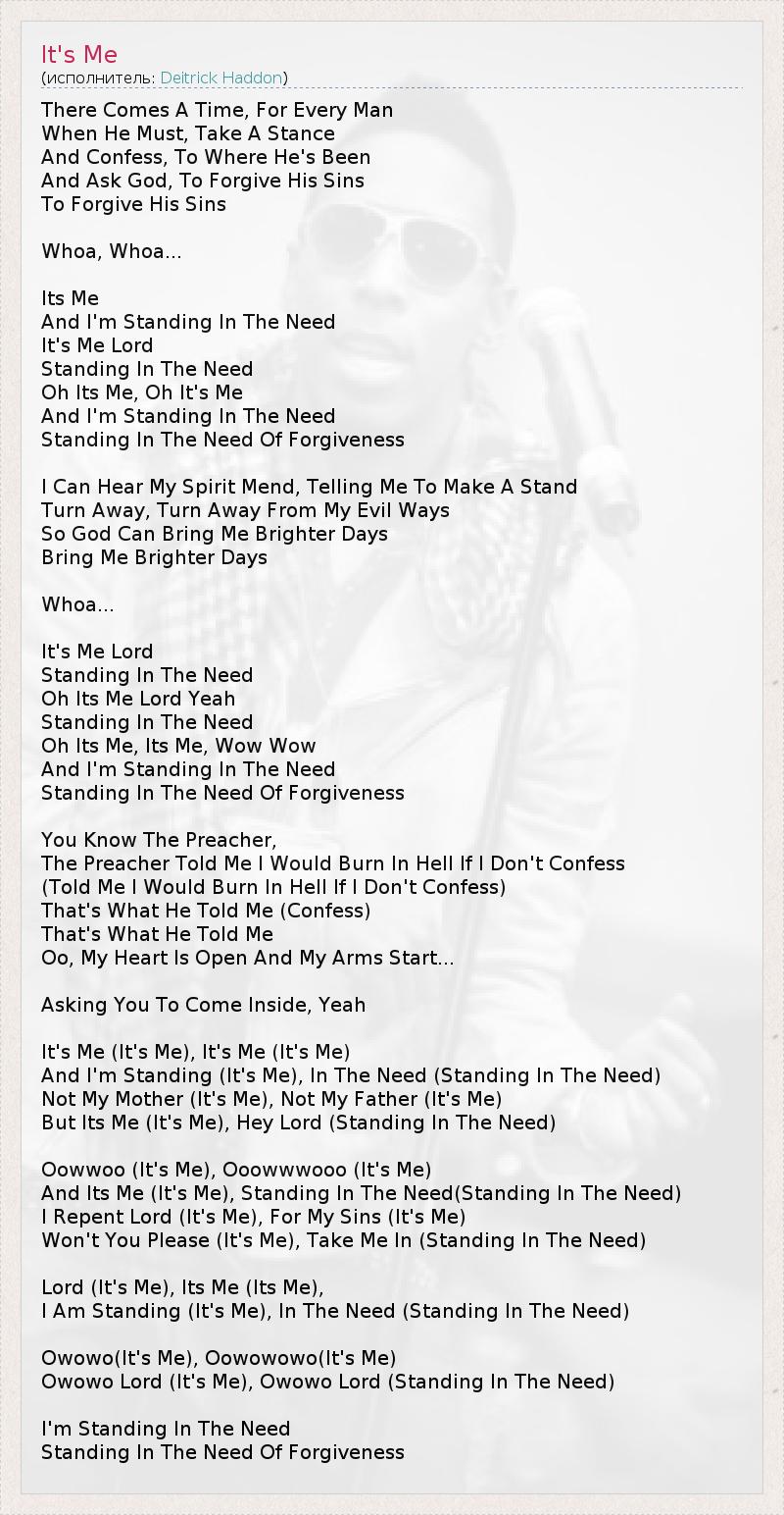 There Comes A Time, For Every Man When He Must, Take A Stance And Confess, To Where He's Been And Ask God, To Forgive His Sins To Forgive His Sins Whoa, Whoa... Its Me And I'm Standing In The Need It's Me Lord Standing In The Need Oh Its Me, Oh It's Me And I'm Standing In The Need Standing In The Need Of Forgiveness I Can Hear My Spirit Mend, Telling Me To Make A Stand Turn Away, Turn Away From My Evil Ways So God Can Bring Me Brighter Days Bring Me Brighter Days Whoa... It's Me Lord Standing In The Need Oh Its Me Lord Yeah Standing In The Need Oh Its Me, Its Me, Wow Wow And I'm Standing In The Need Standing In The Need Of Forgiveness You Know The Preacher, The Preacher Told Me I Would Burn In Hell If I Don't Confess (Told Me I Would Burn In Hell If I Don't Confess) That's What He Told Me (Confess) That's What He Told Me Oo, My Heart Is Open And My Arms Start... Asking You To Come Inside, Yeah It's Me (It's Me), It's Me (It's Me) And I'm Standing (It's Me), In The Need (Standing In The Need) Not My Mother (It's Me), Not My Father (It's Me) But Its Me (It's Me), Hey Lord (Standing In The Need) Oowwoo (It's Me), Ooowwwooo (It's Me) And Its Me (It's Me), Standing In The Need(Standing In The Need) I Repent Lord (It's Me), For My Sins (It's Me) Won't You Please (It's Me), Take Me In (Standing In The Need) Lord (It's Me), Its Me (Its Me), I Am Standing (It's Me), In The Need (Standing In The Need) Owowo(It's Me), Oowowowo(It's Me) Owowo Lord (It's Me), Owowo Lord (Standing In The Need) I'm Standing In The Need Standing In The Need Of Forgiveness