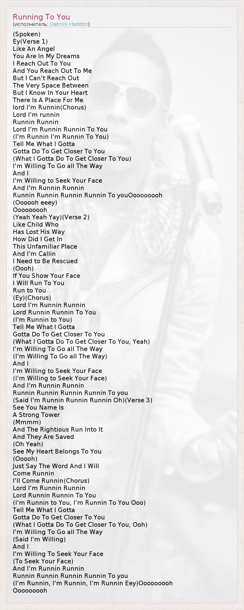 (Spoken) Ey(Verse 1) Like An Angel You Are In My Dreams I Reach Out To You And You Reach Out To Me But I Can't Reach Out The Very Space Between But I Know In Your Heart There Is A Place For Me lord I'm Runnin(Chorus) Lord I'm runnin Runnin Runnin Lord I'm Runnin Runnin To You (I'm Runnin I'm Runnin To You) Tell Me What I Gotta Gotta Do To Get Closer To You (What I Gotta Do To Get Closer To You) I'm Willing To Go all The Way And I I'm Willing to Seek Your Face And I'm Runnin Runnin Runnin Runnin Runnin Runnin To youOoooooooh (Oooooh eeey) Ooooooooh (Yeah Yeah Yay)(Verse 2) Like Child Who Has Lost His Way How Did I Get In This Unfamiliar Place And I'm Callin I Need to Be Rescued (Oooh) If You Show Your Face I Will Run To You Run to You (Ey)(Chorus) Lord I'm Runnin Runnin Lord Runnin Runnin To You (I'm Runnin to You) Tell Me What I Gotta Gotta Do To Get Closer To You (What I Gotta Do To Get Closer To You, Yeah) I'm Willing To Go all The Way (I'm Willing To Go all The Way) And I I'm Willing to Seek Your Face (I'm Willing to Seek Your Face) And I'm Runnin Runnin Runnin Runnin Runnin Runnin To you (Said I'm Runnin Runnin Runnin Oh)(Verse 3) See You Name Is A Strong Tower (Mmmm) And The Rightious Run Into It And They Are Saved (Oh Yeah) See My Heart Belongs To You (Ooooh) Just Say The Word And I Will Come Runnin I'll Come Runnin(Chorus) Lord I'm Runnin Runnin Lord Runnin Runnin To You (I'm Runnin to You, I'm Runnin To You Ooo) Tell Me What I Gotta Gotta Do To Get Closer To You (What I Gotta Do To Get Closer To You, Ooh) I'm Willing To Go all The Way (Said I'm Willing) And I I'm Willing To Seek Your Face (To Seek Your Face) And I'm Runnin Runnin Runnin Runnin Runnin Runnin To you (I'm Runnin, I'm Runnin, I'm Runnin Eey)Ooooooooh Ooooooooh