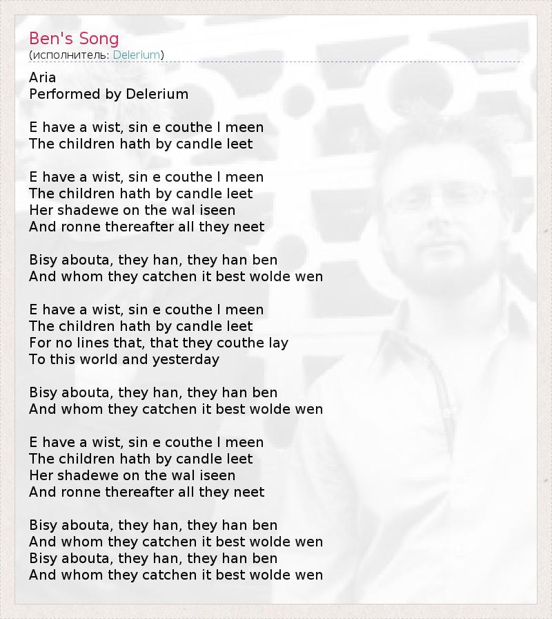 Aria Performed by Delerium E have a wist, sin e couthe I meen The children hath by candle leet E have a wist, sin e couthe I meen The children hath by candle leet Her shadewe on the wal iseen And ronne thereafter all they neet Bisy abouta, they han, they han ben And whom they catchen it best wolde wen E have a wist, sin e couthe I meen The children hath by candle leet For no lines that, that they couthe lay To this world and yesterday Bisy abouta, they han, they han ben And whom they catchen it best wolde wen E have a wist, sin e couthe I meen The children hath by candle leet Her shadewe on the wal iseen And ronne thereafter all they neet Bisy abouta, they han, they han ben And whom they catchen it best wolde wen Bisy abouta, they han, they han ben And whom they catchen it best wolde wen