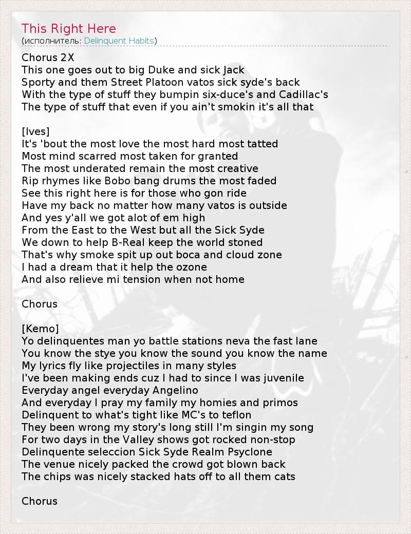 Это интересно:Delinquent Habits были сформированы в Лос-Анджелесе в 1991 году. Эта группа была одной из первых среди Латиноамериканских исполнителей, которые смешали лирику на английском и испанском языках. В состав Delinquent Habits входят два МС - Kemo (David L.K. Thomas) и Ives (Ivan S. Martin), а также DJ - O.G. Style (Alejandro R. Martinez). Дебютировали они на звукозаписывающем лэйбле PMP с одноимённым релизом Delinquent Habits в 1996 году. Альбом, исполнительным... продолжение