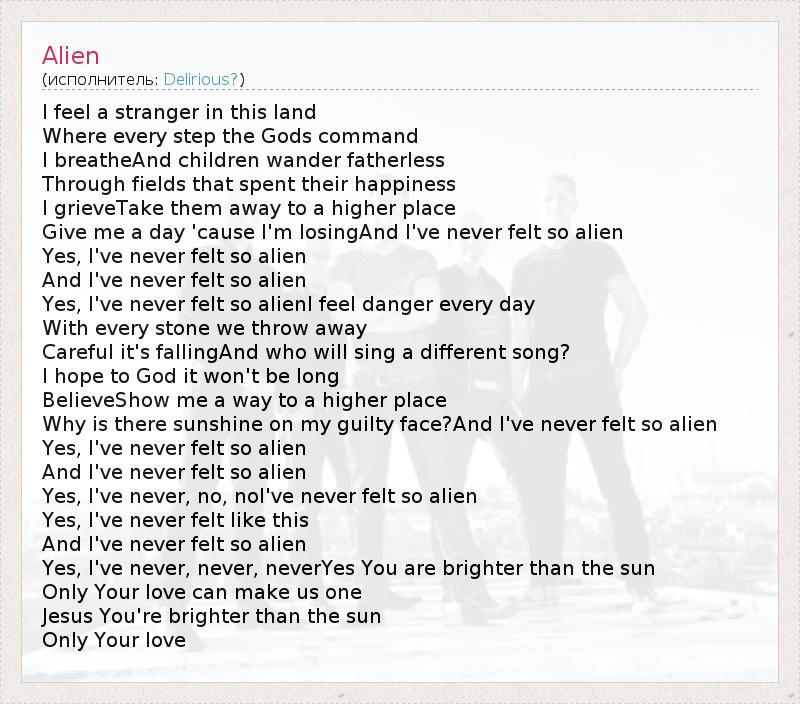 I feel a stranger in this land Where every step the Gods command I breatheAnd children wander fatherless Through fields that spent their happiness I grieveTake them away to a higher place Give me a day 'cause I'm losingAnd I've never felt so alien Yes, I've never felt so alien And I've never felt so alien Yes, I've never felt so alienI feel danger every day With every stone we throw away Careful it's fallingAnd who will sing a different song? I hope to God it won't be long BelieveShow me a way to a higher place Why is there sunshine on my guilty face?And I've never felt so alien Yes, I've never felt so alien And I've never felt so alien Yes, I've never, no, noI've never felt so alien Yes, I've never felt like this And I've never felt so alien Yes, I've never, never, neverYes You are brighter than the sun Only Your love can make us one Jesus You're brighter than the sun Only Your love