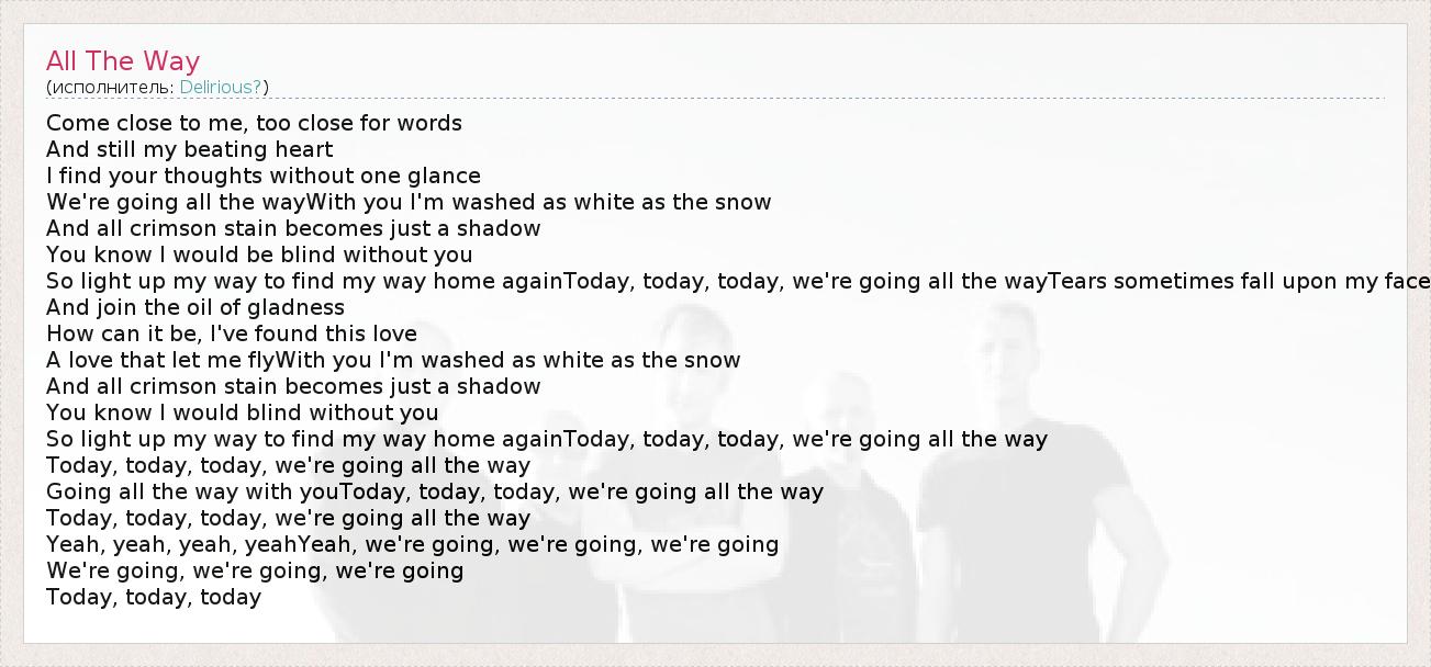 Come close to me, too close for words And still my beating heart I find your thoughts without one glance We're going all the wayWith you I'm washed as white as the snow And all crimson stain becomes just a shadow You know I would be blind without you So light up my way to find my way home againToday, today, today, we're going all the wayTears sometimes fall upon my face And join the oil of gladness How can it be, I've found this love A love that let me flyWith you I'm washed as white as the snow And all crimson stain becomes just a shadow You know I would blind without you So light up my way to find my way home againToday, today, today, we're going all the way Today, today, today, we're going all the way Going all the way with youToday, today, today, we're going all the way Today, today, today, we're going all the way Yeah, yeah, yeah, yeahYeah, we're going, we're going, we're going We're going, we're going, we're going Today, today, today