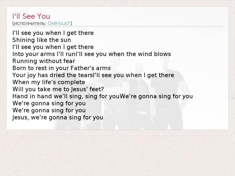 I'll see you when I get there Shining like the sun I'll see you when I get there Into your arms I'll runI'll see you when the wind blows Running without fear Born to rest in your Father's arms Your joy has dried the tearsI'll see you when I get there When my life's complete Will you take me to Jesus' feet? Hand in hand we'll sing, sing for youWe're gonna sing for you We're gonna sing for you We're gonna sing for you Jesus, we're gonna sing for you