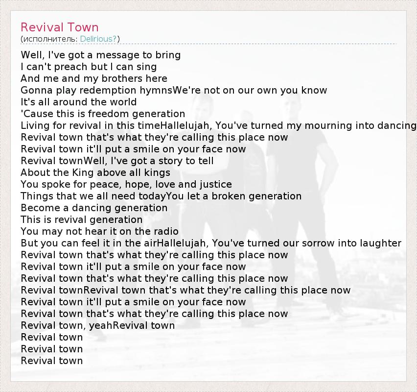 Well, I've got a message to bring I can't preach but I can sing And me and my brothers here Gonna play redemption hymnsWe're not on our own you know It's all around the world 'Cause this is freedom generation Living for revival in this timeHallelujah, You've turned my mourning into dancing Revival town that's what they're calling this place now Revival town it'll put a smile on your face now Revival townWell, I've got a story to tell About the King above all kings You spoke for peace, hope, love and justice Things that we all need todayYou let a broken generation Become a dancing generation This is revival generation You may not hear it on the radio But you can feel it in the airHallelujah, You've turned our sorrow into laughter Revival town that's what they're calling this place now Revival town it'll put a smile on your face now Revival town that's what they're calling this place now Revival townRevival town that's what they're calling this place now Revival town it'll put a smile on your face now Revival town that's what they're calling this place now Revival town, yeahRevival town Revival town Revival town Revival town