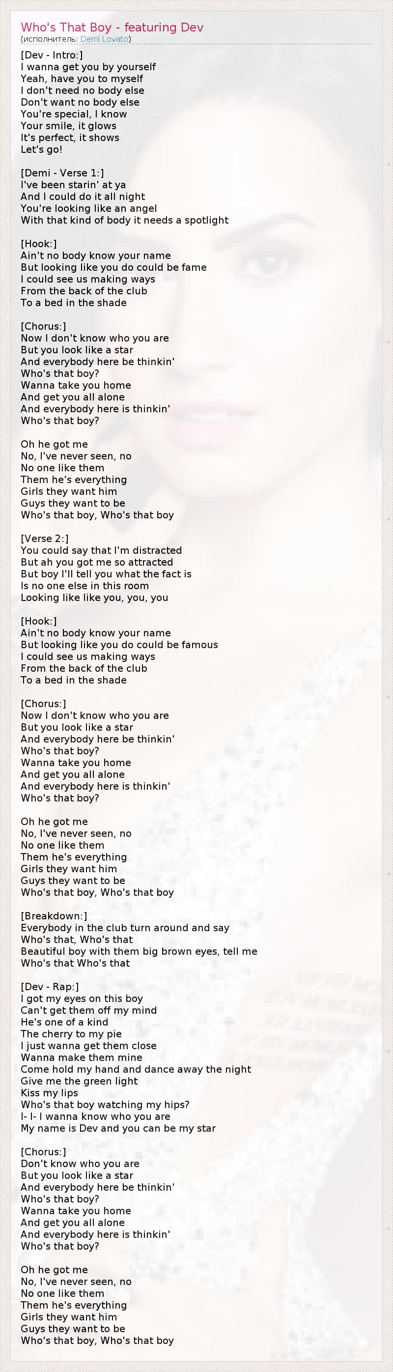 [Dev - Intro:] I wanna get you by yourself Yeah, have you to myself I don't need no body else Don't want no body else You're special, I know Your smile, it glows It's perfect, it shows Let's go! [Demi - Verse 1:] I've been starin' at ya And I could do it all night You're looking like an angel With that kind of body it needs a spotlight [Hook:] Ain't no body know your name But looking like you do could be fame I could see us making ways From the back of the club To a bed in the shade [Chorus:] Now I don't know who you are But you look like a star And everybody here be thinkin' Who's that boy? Wanna take you home And get you all alone And everybody here is thinkin' Who's that boy? Oh he got me No, I've never seen, no No one like them Them he's everything Girls they want him Guys they want to be Who's that boy, Who's that boy [Verse 2:] You could say that I'm distracted But ah you got me so attracted But boy I'll tell you what the fact is Is no one else in this room Looking like like you, you, you [Hook:] Ain't no body know your name But looking like you do could be famous I could see us making ways From the back of the club To a bed in the shade [Chorus:] Now I don't know who you are But you look like a star And everybody here be thinkin' Who's that boy? Wanna take you home And get you all alone And everybody here is thinkin' Who's that boy? Oh he got me No, I've never seen, no No one like them Them he's everything Girls they want him Guys they want to be Who's that boy, Who's that boy [Breakdown:] Everybody in the club turn around and say Who's that, Who's that Beautiful boy with them big brown eyes, tell me Who's that Who's that [Dev - Rap:] I got my eyes on this boy Can't get them off my mind He's one of a kind The cherry to my pie I just wanna get them close Wanna make them mine Come hold my hand and dance away the night Give me the green light Kiss my lips Who's that boy watching my hips? I- I- I wanna know who you are My name is Dev and you can be my star [Chorus:] Don't know who you are But you look like a star And everybody here be thinkin' Who's that boy? Wanna take you home And get you all alone And everybody here is thinkin' Who's that boy? Oh he got me No, I've never seen, no No one like them Them he's everything Girls they want him Guys they want to be Who's that boy, Who's that boy