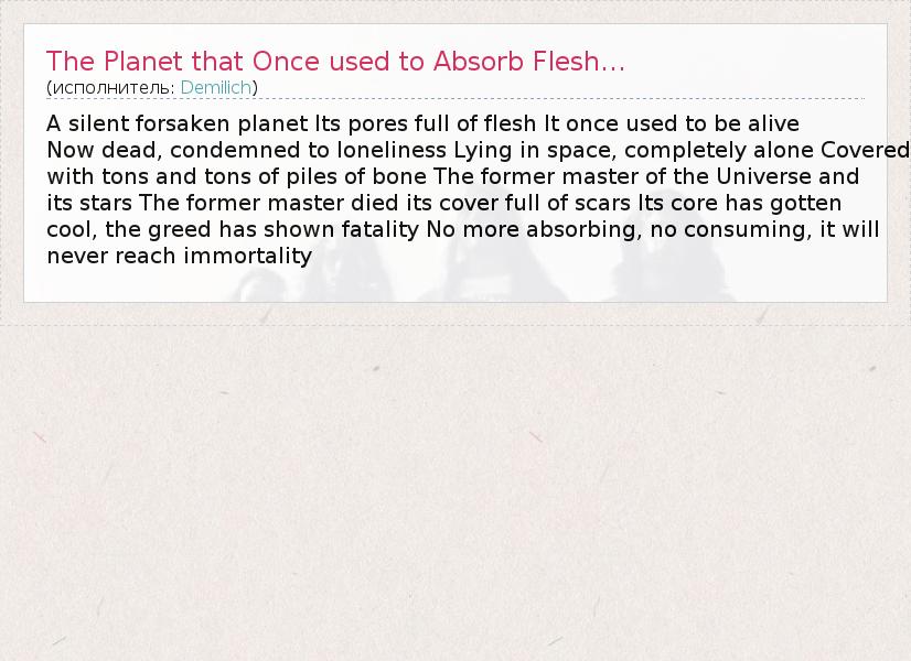 А как ты думаешь, о чем песня "The Planet that Once used to Absorb Flesh…" ?