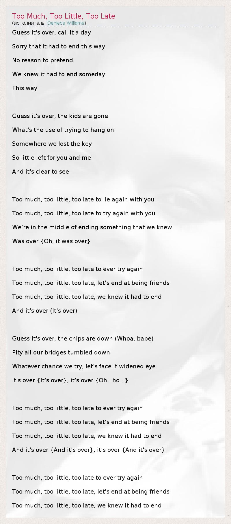А как ты думаешь, о чем песня "Too Much, Too Little, Too Late" ?