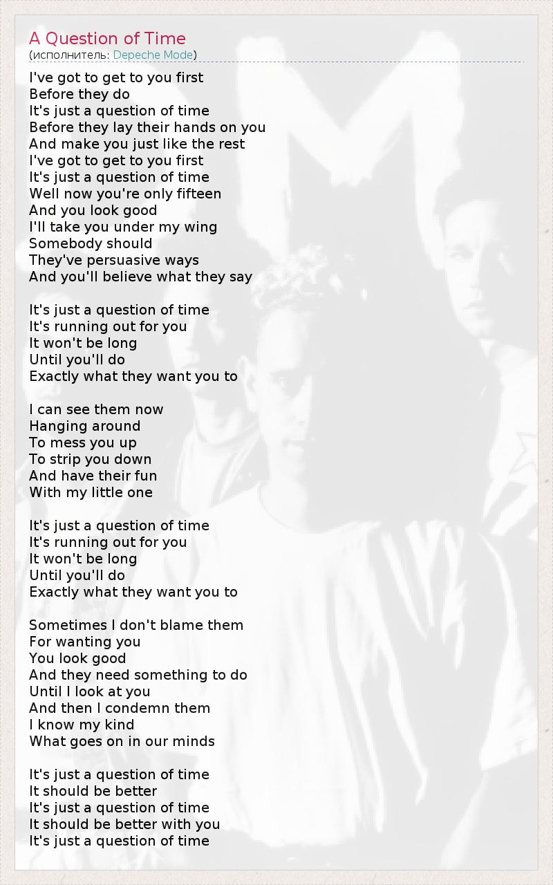 Я должен завоевать тебя до того, Как до них дойдёт, что они уже опоздали Это лишь вопрос времени - Когда они до тебя доберутся И сделают тебя такой же, как все. И поэтому я должен спасти тебя от них, Это лишь вопрос времени.... Ну да, тебе всего-то пятнадцать лет, Но ты такая милашка, Я буду заботиться о тебе, Потому что-то кто-то должен это сделать. А они могут убедить тебя доверять им И заставить тебя им верить... Это лишь вопрос времени, И твоё время истекает. Ведь это для тебя Не займёт много времени, А "это" - именно то, что они от тебя хотят... Я вижу, как они Виснут на тебе, стремясь Затащить тебя в постель, Совратить И порезвиться С моей малышкой. Это лишь вопрос времени, И твоё время истекает. Ведь это для тебя Не займёт много времени, А "это" - именно то, что они от тебя хотят... Иногда я понимаю, почему Они тебя хотят - Ты так хороша, И им нужно срочно что-то делать, А до того, как я посмотрю на них И начну их осуждать, Я осознаю, что Хочу от тебя того же, что и они... Это лишь вопрос времени Чем быстрее, тем лучше Это лишь вопрос времени Для тебя чем быстрее, тем лучше Это лишь вопрос времени...
