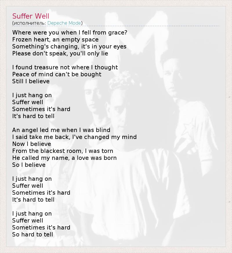 Where were you when I fell from grace? Frozen heart, an empty space Something's changing, it's in your eyes Please don't speak, you'll only lie I found treasure not where I thought Peace of mind can't be bought Still I believe I just hang on Suffer well Sometimes it's hard It's hard to tell An angel led me when I was blind I said take me back, I've changed my mind Now I believe From the blackest room, I was torn He called my name, a love was born So I believe I just hang on Suffer well Sometimes it's hard It's hard to tell I just hang on Suffer well Sometimes it's hard So hard to tell