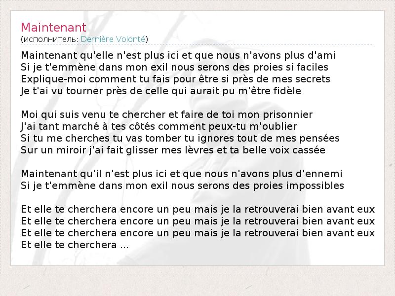 Это интересно:• Одно из главных явлений европейской пост-индустриальной сцены нулевых французский проект Derniere Volonte (с франц. «последняя воля» или «последнее желание» перед казнью) возник в катакомбах амбициозного кассетного лейбла La Nouvelle Audience и в рекордно сжатые сроки занял лидирующие позиции в сфере martial industrial - первые, но отнюдь не робкие альбомы уже во многом не уступали классикам жанра уровня... продолжение