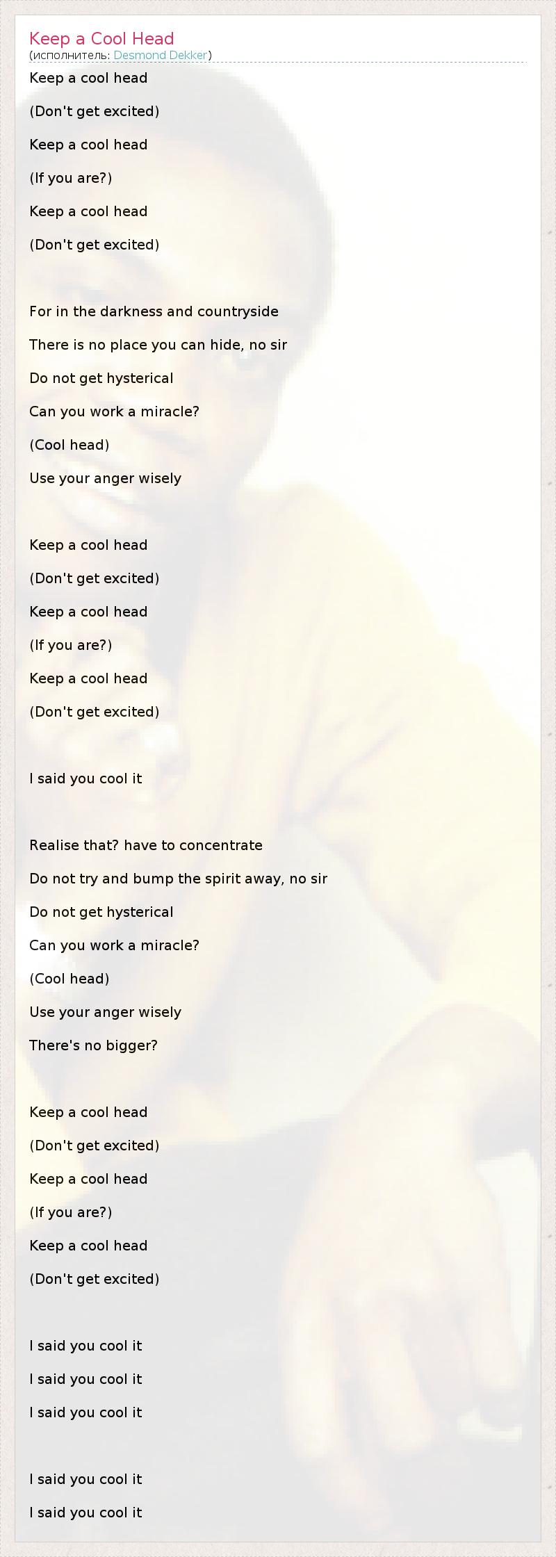 Keep a cool head (Don't get excited) Keep a cool head (If you are?) Keep a cool head (Don't get excited) For in the darkness and countryside There is no place you can hide, no sir Do not get hysterical Can you work a miracle? (Cool head) Use your anger wisely Keep a cool head (Don't get excited) Keep a cool head (If you are?) Keep a cool head (Don't get excited) I said you cool it Realise that? have to concentrate Do not try and bump the spirit away, no sir Do not get hysterical Can you work a miracle? (Cool head) Use your anger wisely There's no bigger? Keep a cool head (Don't get excited) Keep a cool head (If you are?) Keep a cool head (Don't get excited) I said you cool it I said you cool it I said you cool it I said you cool it I said you cool it