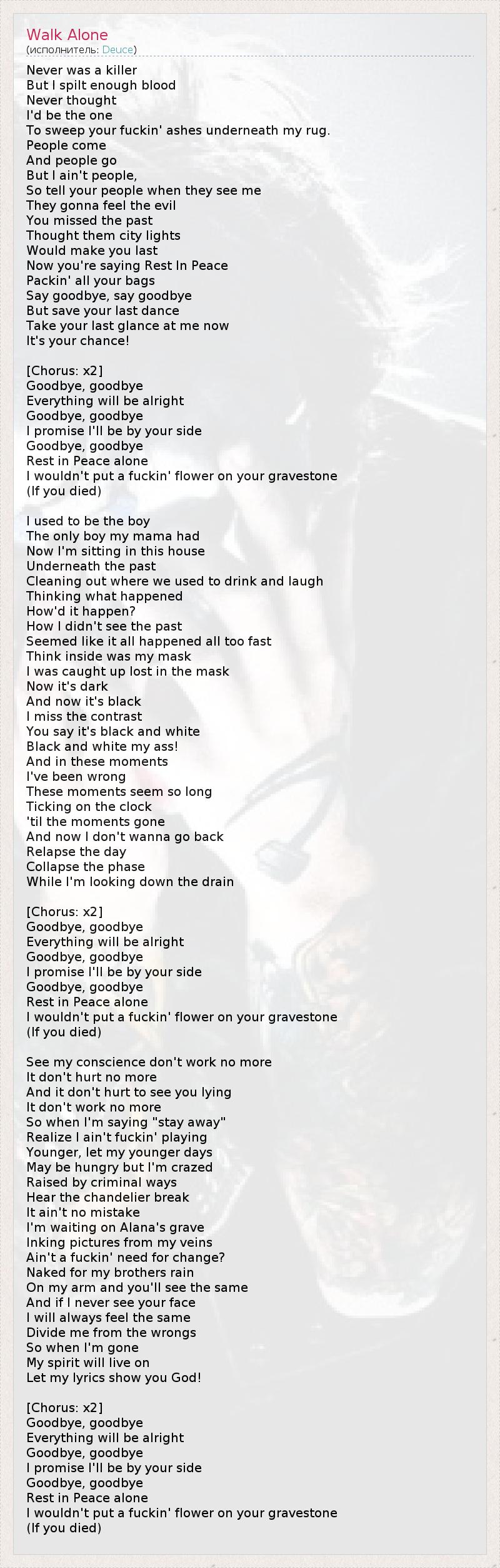 Никогда не был убийцей, Но я пролил достаточно крови. Никогда не думал, Что буду в одиночку Прятать твой греб*ный пепел под своим ковриком. Люди приходят, И люди уходят, Но я - не люди. Так скажи своим людям, что когда они меня увидят, Они почувствуют зло. Ты упустила прошлое, Думая, что огни большого города Помогут тебе продержаться. Теперь ты говоришь "покойся с миром", Пакуя свои сумки. Скажи "прощай", скажи "прощай", Но оставь мне свой последний танец, Взгляни на меня последний раз, Это твой шанс! [Припев: x2] Прощай, прощай, Все будет хорошо! Прощай, прощай, Я обещаю, что буду рядом. Прощай, прощай, Покойся с миром одна, Я не принес бы тебе и жалкого цветочка на могилу (Если бы ты умерла) Когда-то я был маленьким мальчиком, Единственным мальчиком, что был у моей мамы. А теперь я сижу в этом доме Под гнетом моего прошлого, Пытаясь забыть, где мы выпивали и смеялись, Думая о том, что произошло. Как это случилось? Как я не видел прошлого? Такое чувство, что все случилось слишком быстро. Думаю, внутри была моя маска. Погрузившись в неё, я растворился в ней, И стало темно. Теперь в кромешной тьме Мне не хватает контраста. Ты говоришь, она черно-белая, Черно-белая моя зад**ца! И в такие мгновения Я не прав, Эти мгновения кажутся такими долгими. Часы тикают, Пока не кончатся эти мгновения, И я не хочу возвращаться назад, Чтобы снова пережить этот день В свёрнутом виде, Глядя в пустоту. [Припев: x2] Прощай, прощай, Все будет хорошо! Прощай, прощай, Я обещаю, что буду рядом. Прощай, прощай, Покойся с миром одна, Я не принес бы тебе и жалкого цветочка на могилу (Если бы ты умерла) Видишь ли, меня больше не терзает совесть. Мне уже не больно, Меня не ранит твоя ложь, Это больше не работает. Поэтому когда я говорю "Держись от меня подальше" Пойми, я не шучу. Годы, верните мне мои детские годы, Может, я голоден, но я псих, Воспитанный в криминальной среде. Слышишь, как разбилась люстра, И это не ошибка. Я жду на могиле у Аланы, Рисуя кровью своих вен - Разве не это чертова потребность в переменах? Обнажённый, пока мои братья плачут На моей руки, и тебя ждет то же самое. И если я никогда не увижу твоего лица, Я буду чувствовать то же самое. Раздели меня и мои ошибки Так, чтобы когда я уйду, Мой дух продолжил жить, Пусть мои стихи откроют тебе Бога! [Припев: x2] Прощай, прощай, Все будет хорошо! Прощай, прощай, Я обещаю, что буду рядом. Прощай, прощай, Покойся с миром одна, Я не принес бы тебе и жалкого цветочка на могилу (Если бы ты умерла)