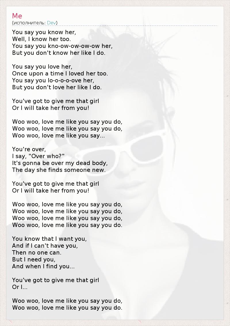You say you know her, Well, I know her too. You say you kno-ow-ow-ow-ow her, But you don't know her like I do. You say you love her, Once upon a time I loved her too. You say you lo-o-o-o-ove her, But you don't love her like I do. You've got to give me that girl Or I will take her from you! Woo woo, love me like you say you do, Woo woo, love me like you say you do, Woo woo, love me like you say... You're over, I say, "Over who?" It's gonna be over my dead body, The day she finds someone new. You've got to give me that girl Or I will take her from you! Woo woo, love me like you say you do, Woo woo, love me like you say you do, Woo woo, love me like you say you do, Woo woo, love me like you say you do. You know that I want you, And if I can't have you, Then no one can. But I need you, And when I find you... You've got to give me that girl Or I... Woo woo, love me like you say you do, Woo woo, love me like you say you do.