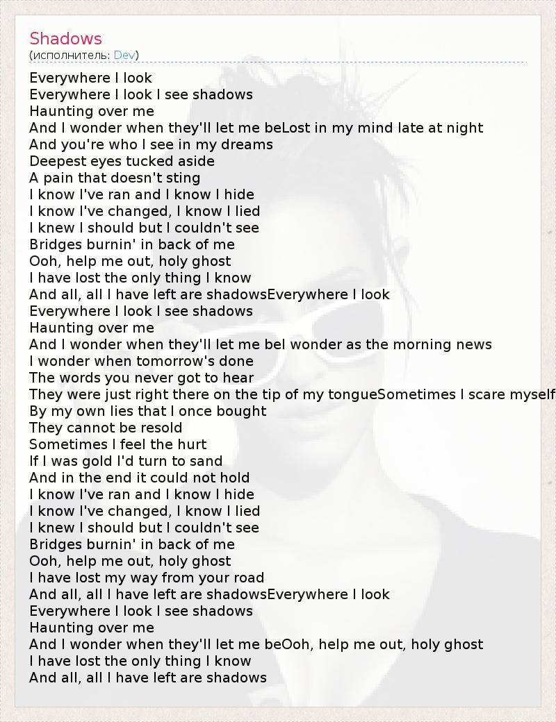 Everywhere I look Everywhere I look I see shadows Haunting over me And I wonder when they'll let me beLost in my mind late at night And you're who I see in my dreams Deepest eyes tucked aside A pain that doesn't sting I know I've ran and I know I hide I know I've changed, I know I lied I knew I should but I couldn't see Bridges burnin' in back of me Ooh, help me out, holy ghost I have lost the only thing I know And all, all I have left are shadowsEverywhere I look Everywhere I look I see shadows Haunting over me And I wonder when they'll let me beI wonder as the morning news I wonder when tomorrow's done The words you never got to hear They were just right there on the tip of my tongueSometimes I scare myself By my own lies that I once bought They cannot be resold Sometimes I feel the hurt If I was gold I'd turn to sand And in the end it could not hold I know I've ran and I know I hide I know I've changed, I know I lied I knew I should but I couldn't see Bridges burnin' in back of me Ooh, help me out, holy ghost I have lost my way from your road And all, all I have left are shadowsEverywhere I look Everywhere I look I see shadows Haunting over me And I wonder when they'll let me beOoh, help me out, holy ghost I have lost the only thing I know And all, all I have left are shadows